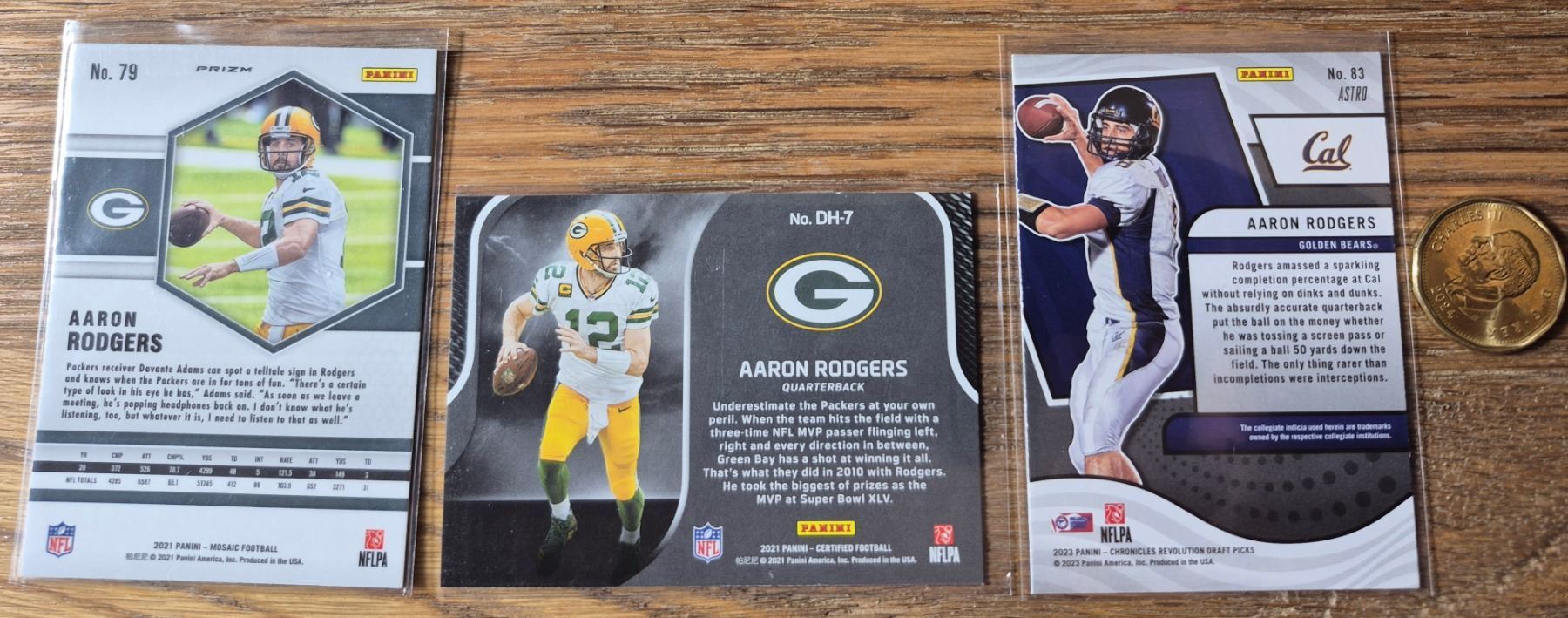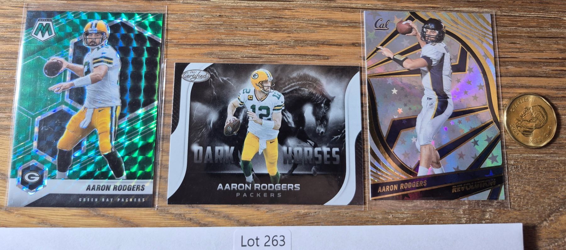 Three-card Aaron Rodgers lot including a Mosaic green parallel, Certified Dark Horses insert, and Revolution Astro parallel.