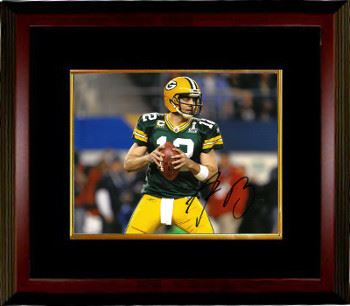 Aaron Rodgers became the Green Bay Packers' starting quarterback in 2008 and led them to a victory in Super Bowl XLV after the 2010 NFL season. Rodgers was named Super Bowl MVP. As a result, he was named Associated Press Athlete of the Year in 2011. He was also voted league MVP after the 2011 NFL season, as well as being voted the top player in the league by his peers. Aaron Rodgers has hand autographed this Green Bay Packers 8x10 Photo. Certificate of Authenticity from Athlon Sports. Custom Black Mat and Premium Mahogany Frame as shown.