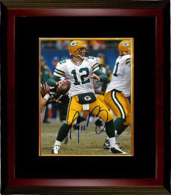 Aaron Rodgers became the Green Bay Packers' starting quarterback in 2008 and led them to a victory in Super Bowl XLV after the 2010 NFL season. Rodgers was named Super Bowl MVP. As a result, he was named Associated Press Athlete of the Year in 2011. He was also voted league MVP after the 2011 NFL season, as well as being voted the top player in the league by his peers. Aaron Rodgers has hand autographed this Green Bay Packers 8x10 Photo. Certificate of Authenticity from Athlon Sports. Custom Black Mat and Premium Mahogany Frame as shown.