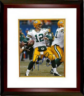 Aaron Rodgers became the Green Bay Packers' starting quarterback in 2008 and led them to a victory in Super Bowl XLV after the 2010 NFL season. Rodgers was named Super Bowl MVP. As a result, he was named Associated Press Athlete of the Year in 2011. He was also voted league MVP after the 2011 NFL season, as well as being voted the top player in the league by his peers. Aaron Rodgers has hand autographed this Green Bay Packers 8x10 Photo. Certificate of Authenticity from Athlon Sports. Custom White Mat and Premium Mahogany Frame as shown.