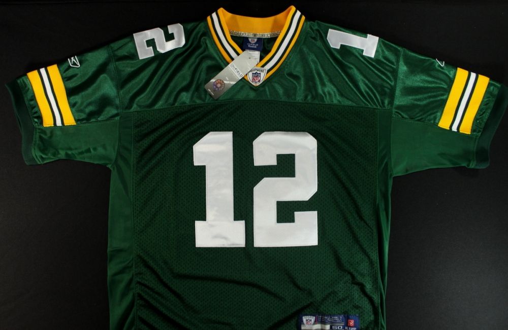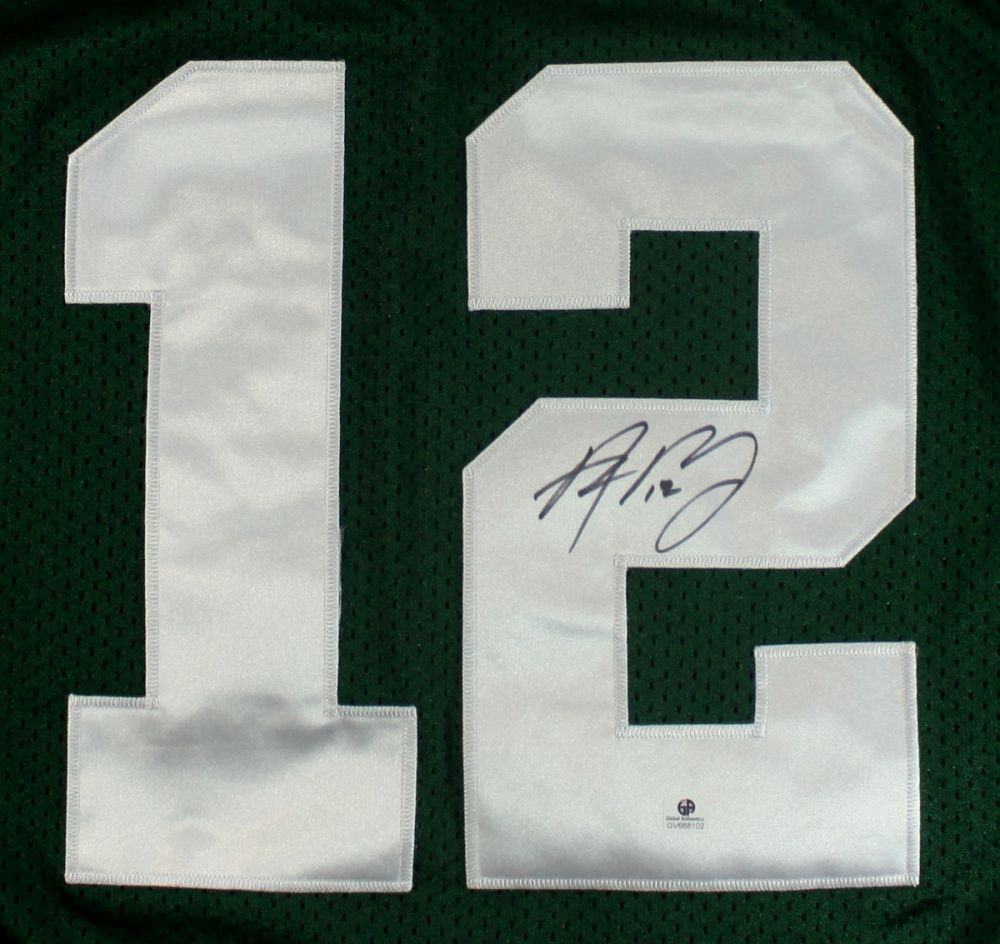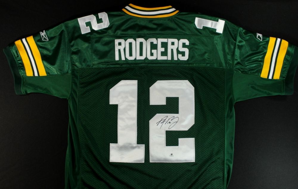Reebok on-field style jersey. Everything is sewn on, size 50. Hand-signed in black felt-tip pen by Aaron Rodgers. This item includes a Global Authentics hologram for authenticity purposes.