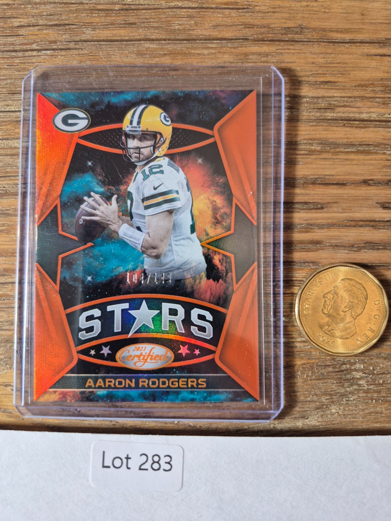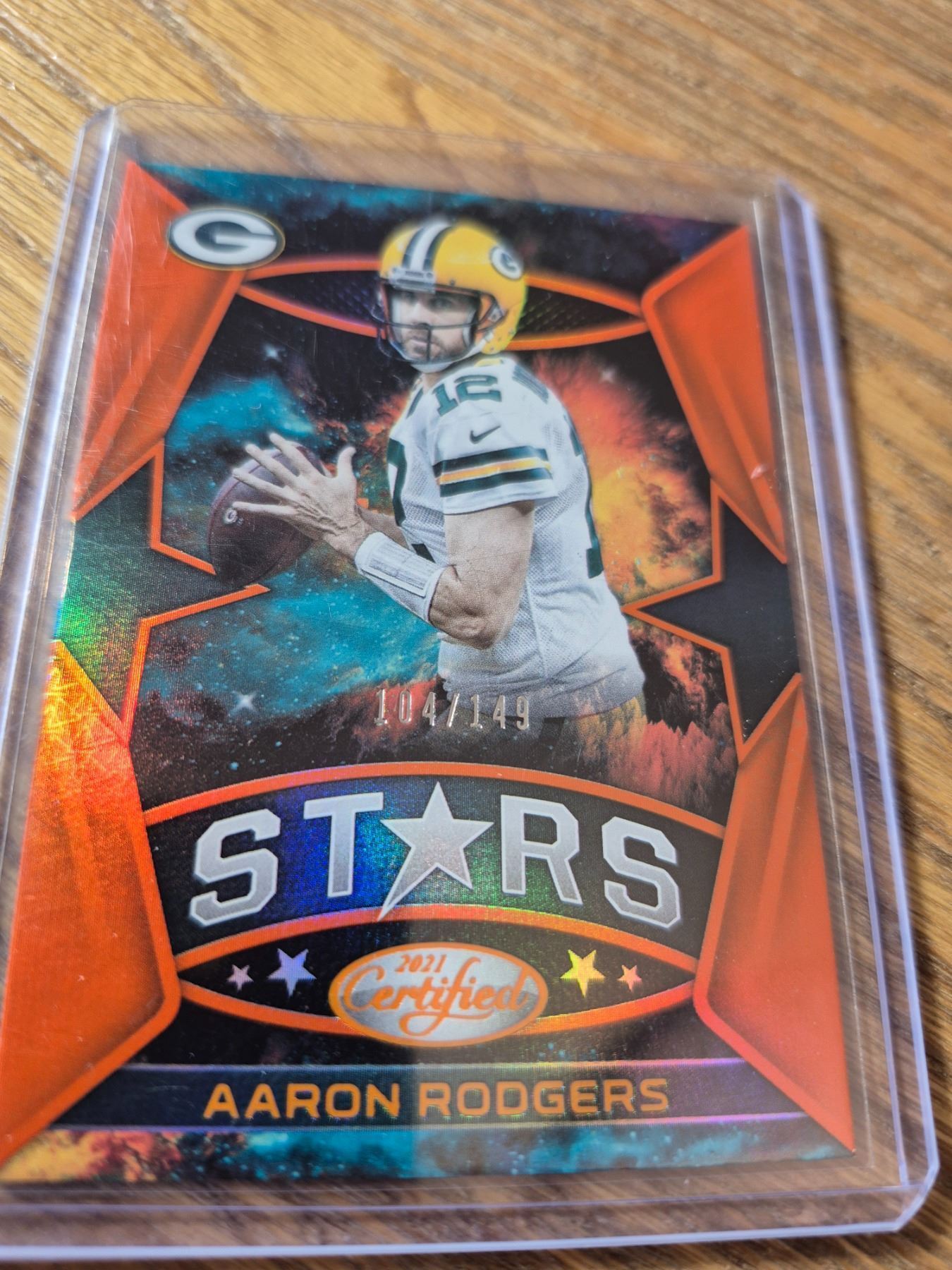 2021 Certified Football “Stars” Aaron Rodgers orange parallel, serial-numbered 104/149.
