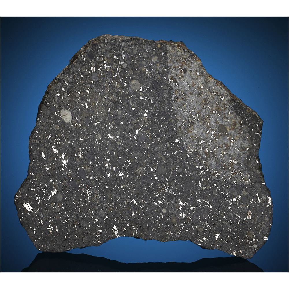 A superb complete slice of an alluring meteorite — the best specimens of Aba Panu specimens feature two lithologies, as seen in the current example. Metallic flakes originating from the core of an asteroid are suspended throughout the matrix.
