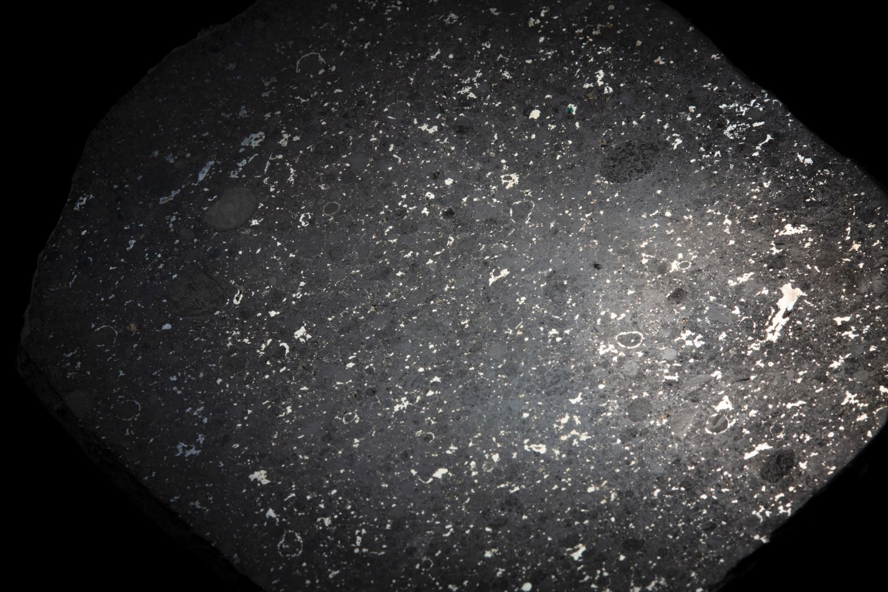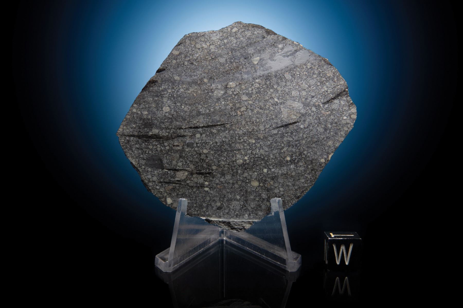 Stone meteorite, chondrite, L3. Witnessed fall, Oyo, Nigeria, April 19, 2018. Laboratory-prepared full slice weighing 45.7 grams and measuring 69 mm x 66 mm x 4 mm. A beautiful oval slice packed with fine, multi-colored chondrules. One face has been highly polished on a diamond lap; the other retains the saw-cut aspect. Accompanied by a certificate of authenticity from Aerolite Meteorites.