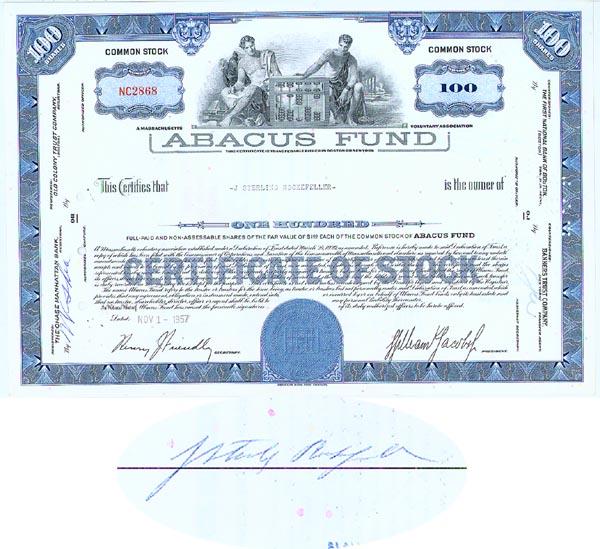 1957, Massachusetts. Stock certificate for 100 shares. Issued to and signed by John Sterling Rockefeller (1904-1988). Grandson of William Rockefeller. Blue/White. Vignette at top center of an abacus flanked by allegorical male figures. Perferation and punch cancelled. Very fine.