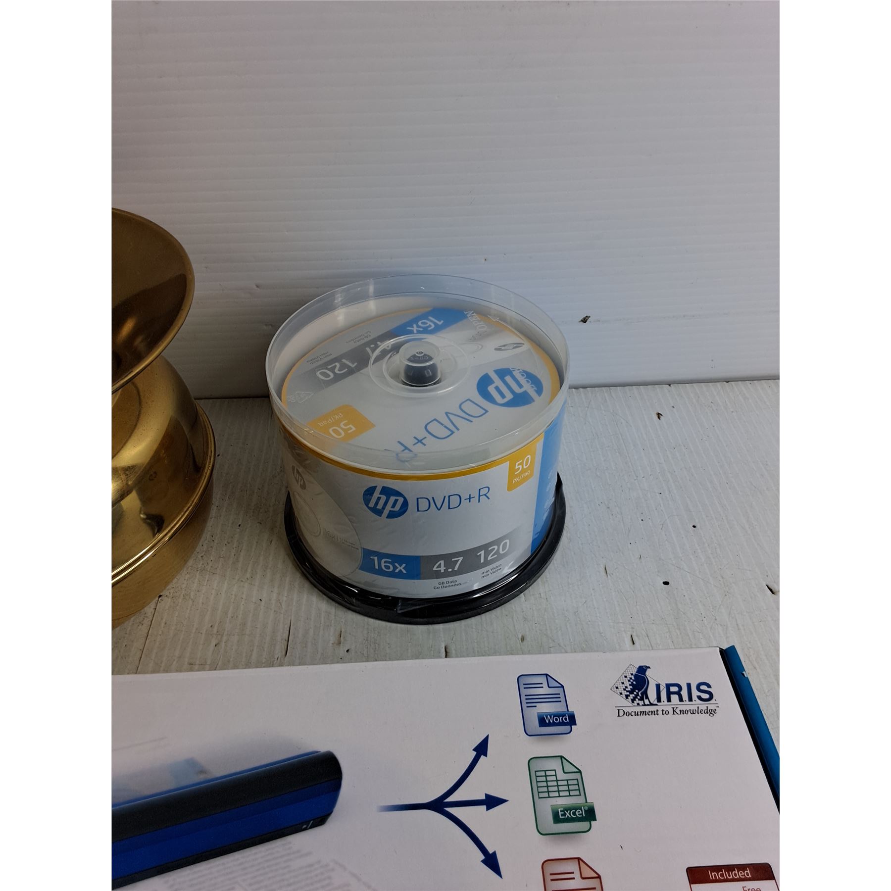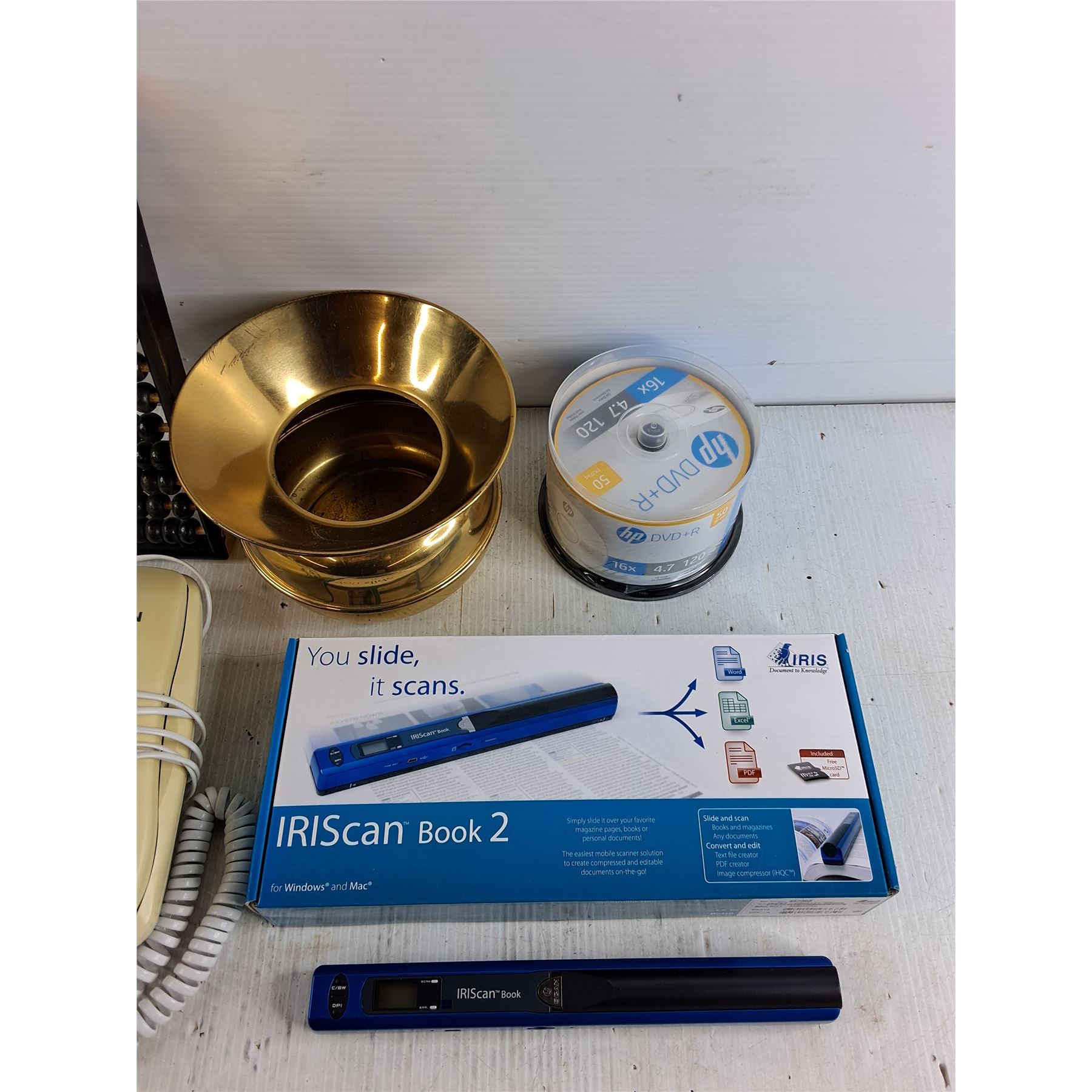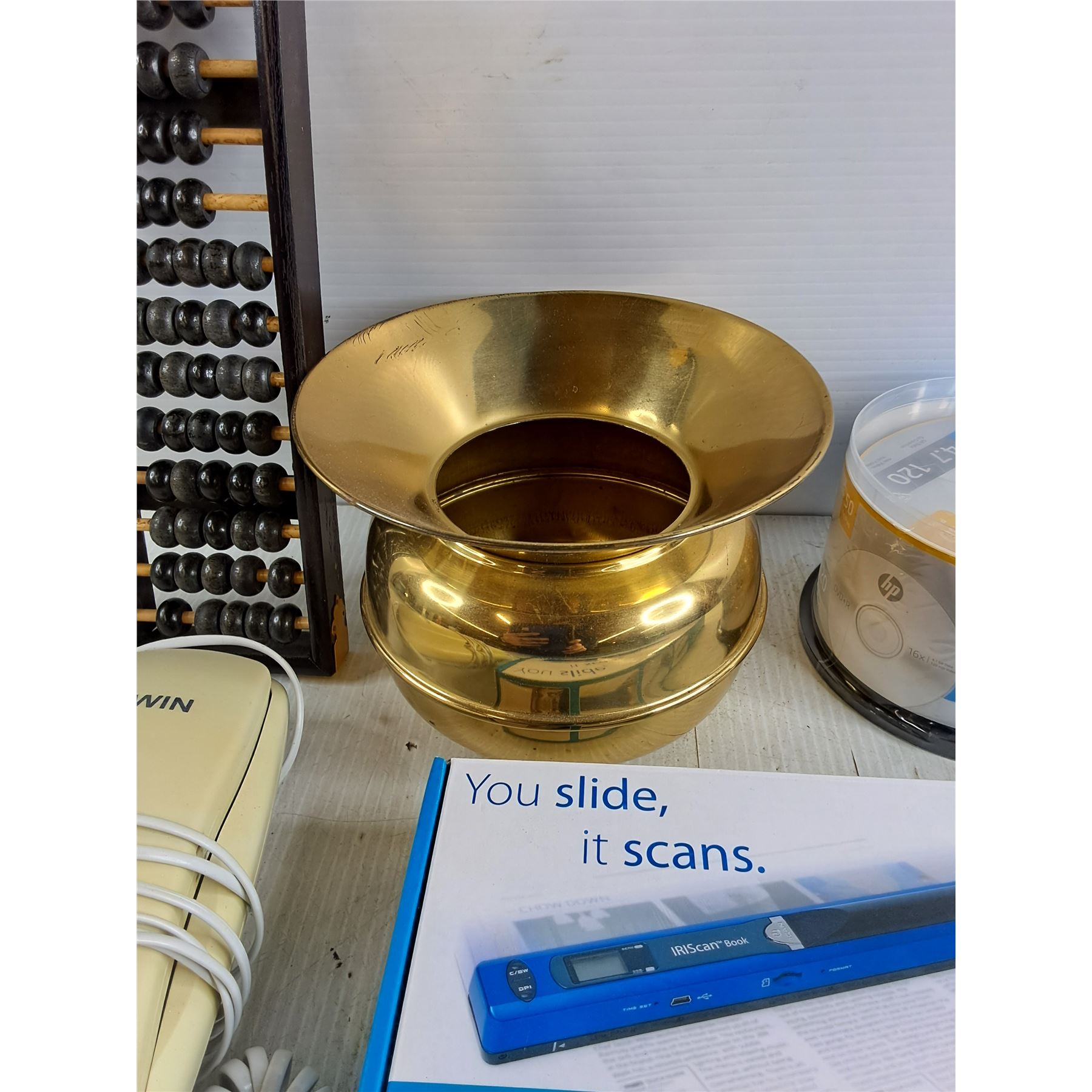 Abacus, IRIScan Book 2, Brass Spittoon, HP DVD+R, Jwin Telephone, As Is