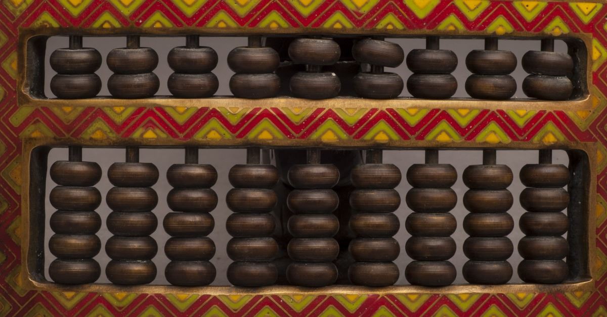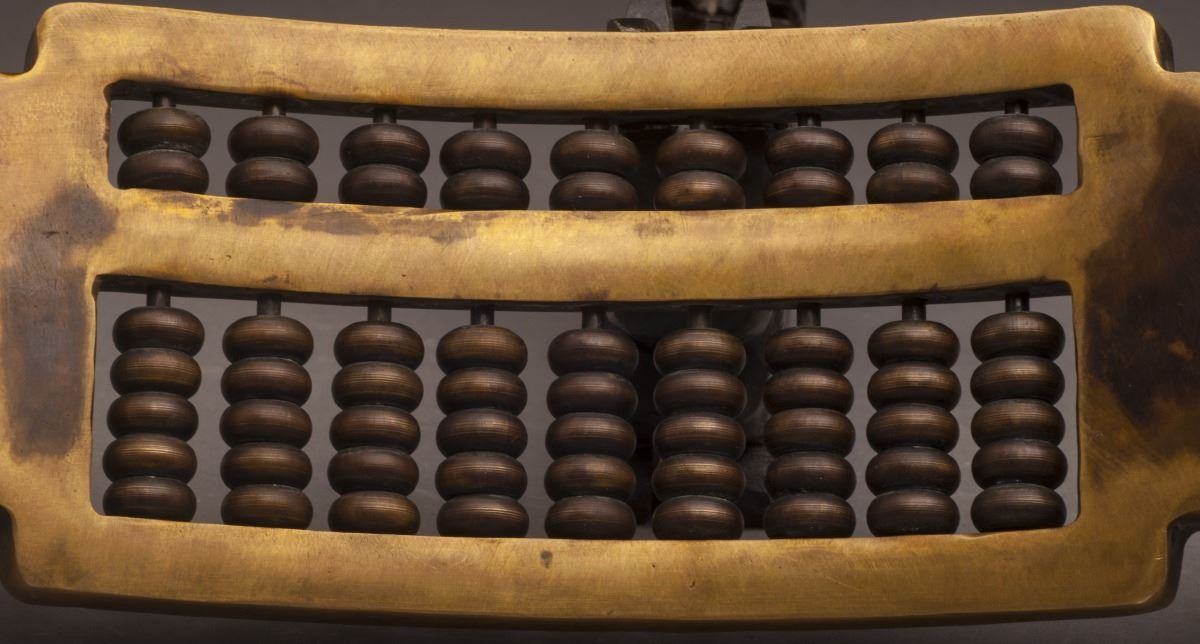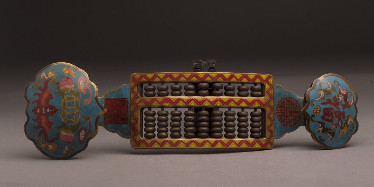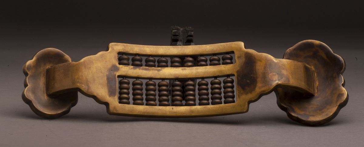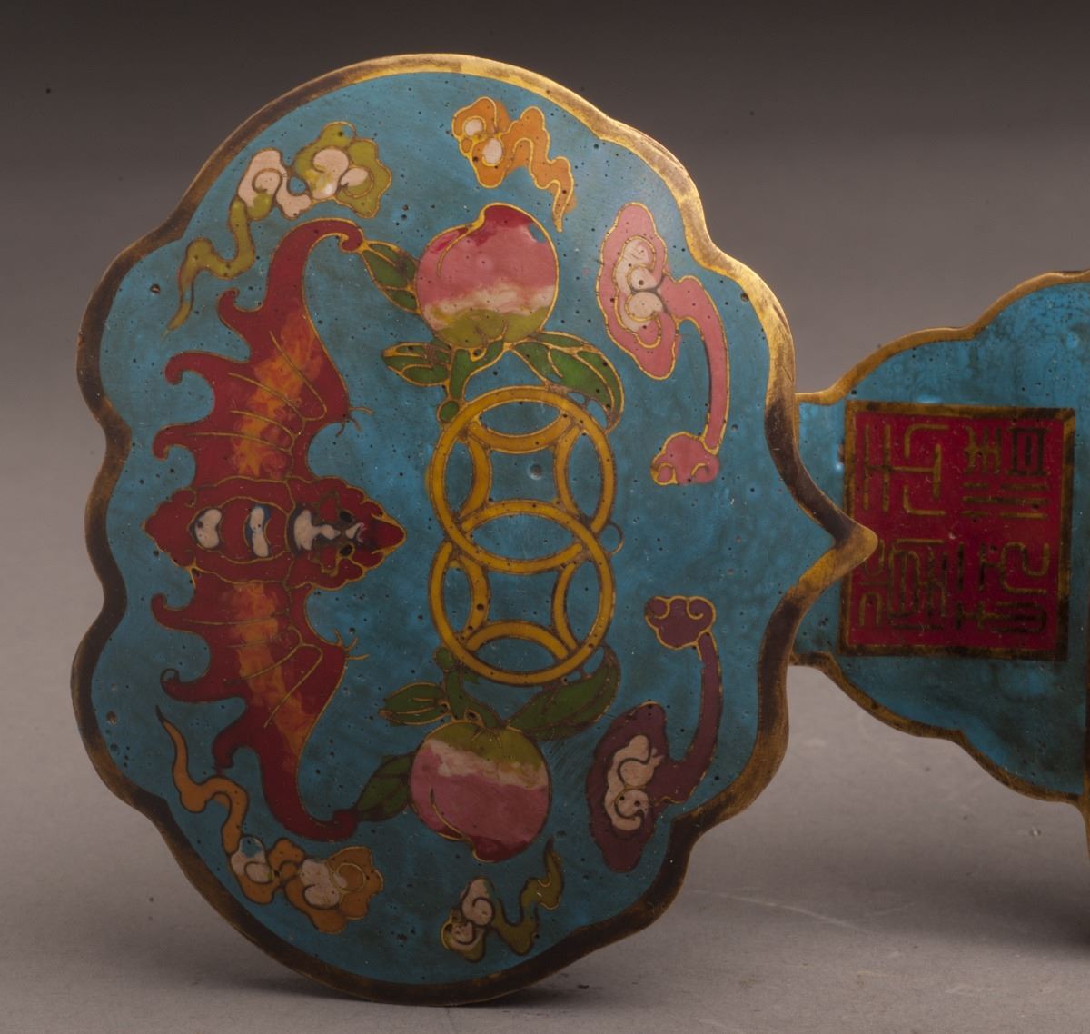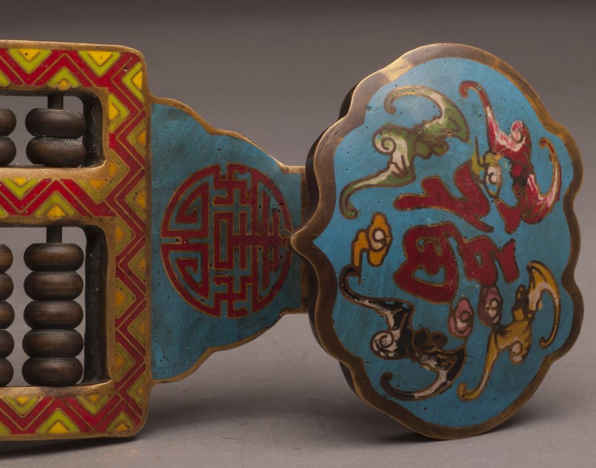 A Fine And Unique Designed Bronze Ruyi, Designed As The Form Of A Abacus In The Middle. Painted With Vivid Bat Patterns At Head, Glazed In Blue Tone As The Base.