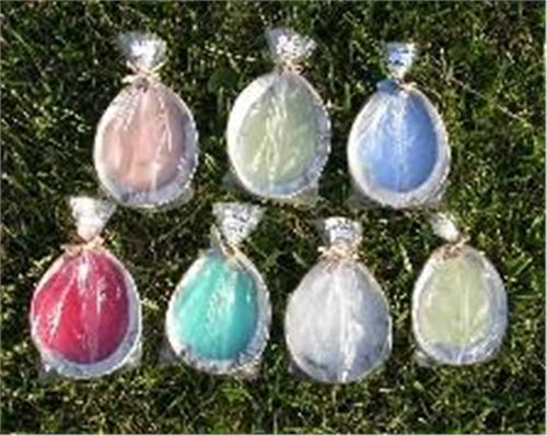 The natural holes along the edge of the shells have been plugged and the shells have been filled to the brim with wax that comes in a variety of scents. The candles come in a poly bag that is tied at the top with raffia and has a piece of dyed abalone shell for decoration. The shells are between 5" and 7" wide and 1.5" to 2" deep.