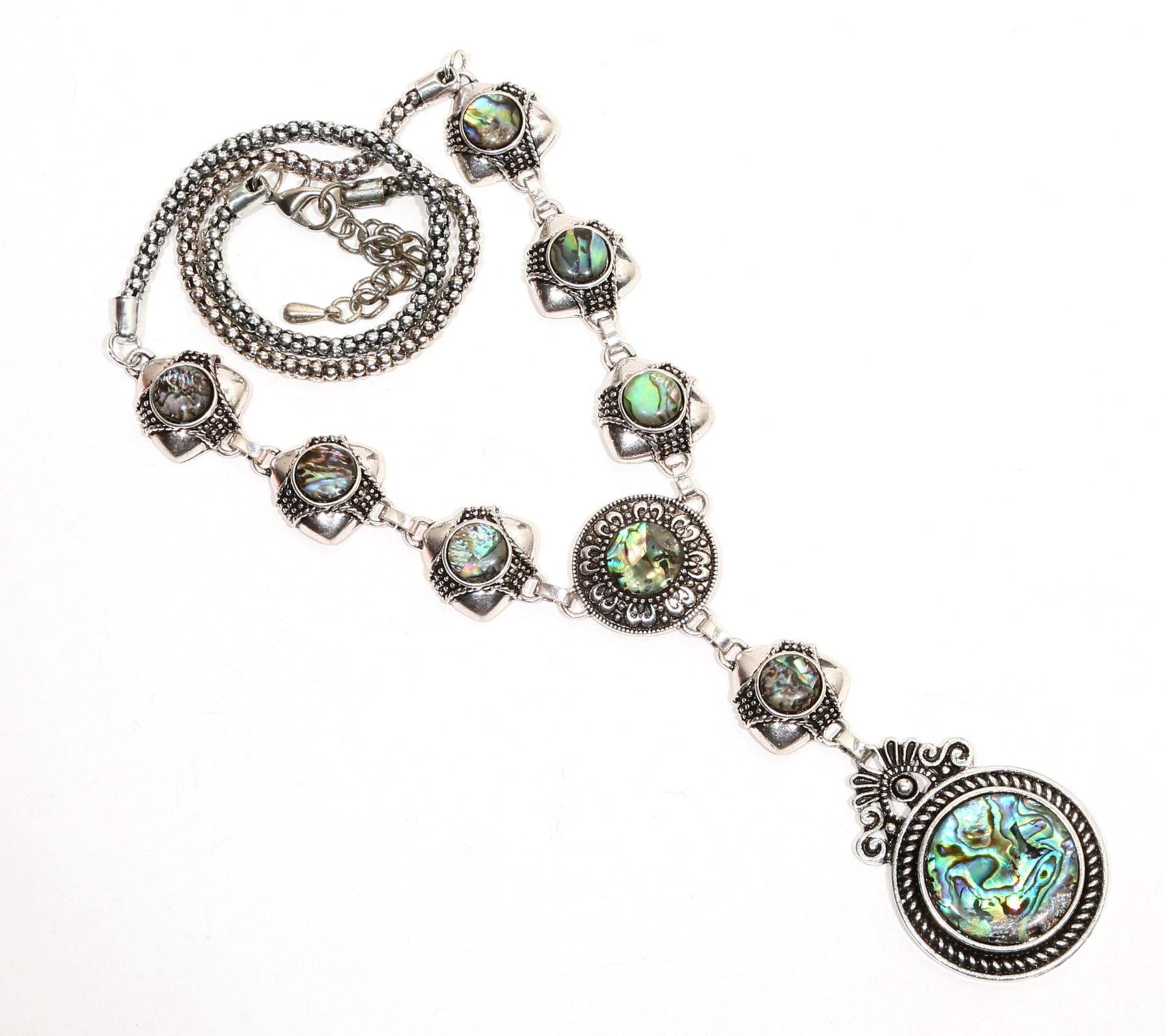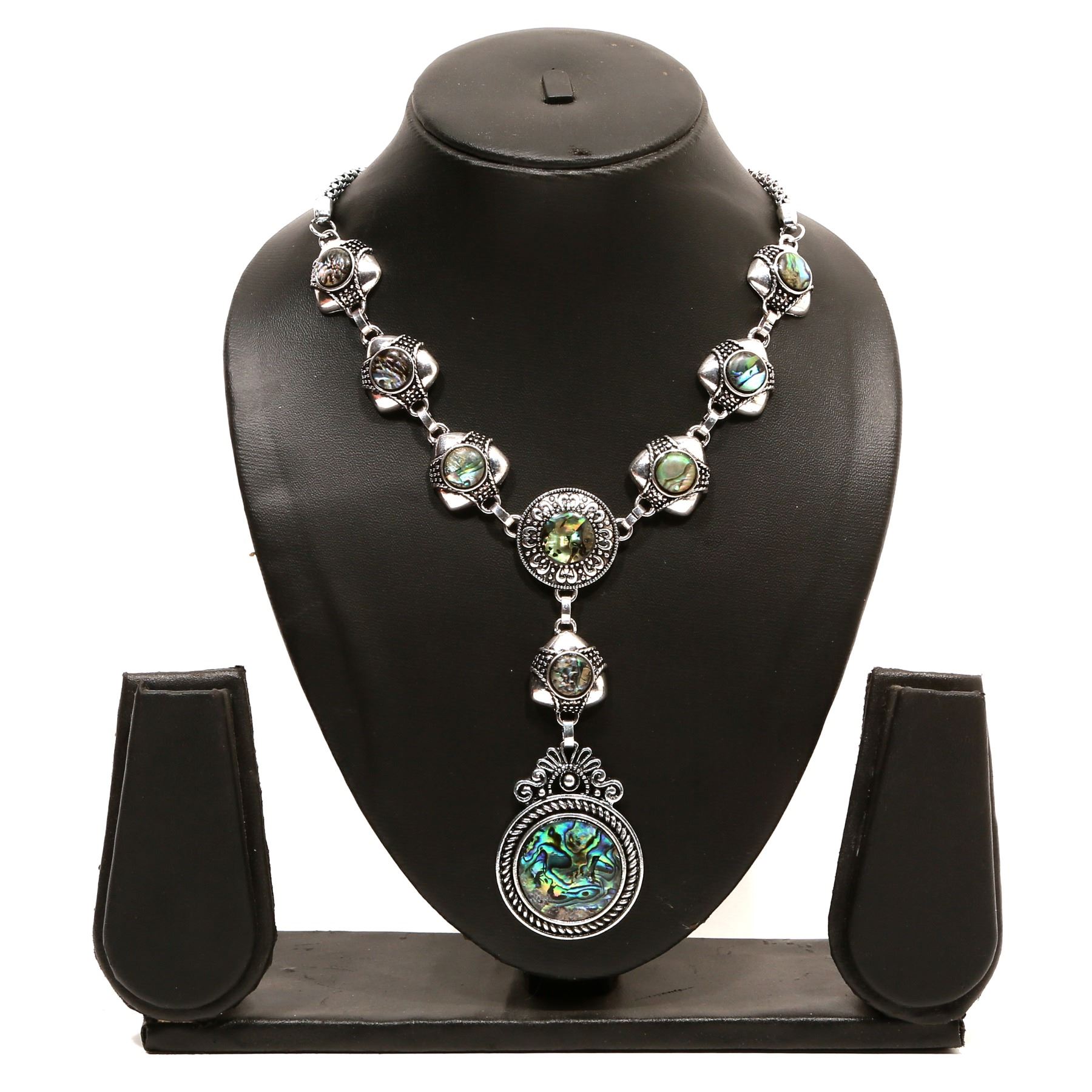Abalone Shell Gemstone Silver Plated Antique Designer Necklace Jewelry 18" Inches With Adjustable Links , Jewelry Type : Necklace , Gemstone : Abalone Shell , Necklace Length : 18 Inches (With adjustable Links) , Necklace Weight : 56.82 Grams.