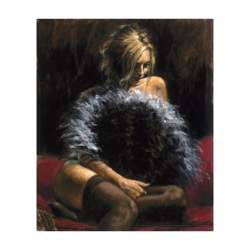 "Abanico De Plumas" is a hand embellished limited edition giclee on stretched canvas by Fabian Perez. The piece is numbered and hand signed by the artist and comes with a Certificate of Authenticity. Measures approx. 40" x 30" (image). Please allow 5 additional business for items that include canvas stretch or framing.