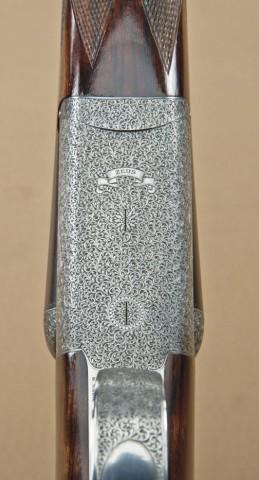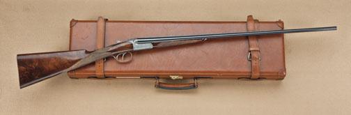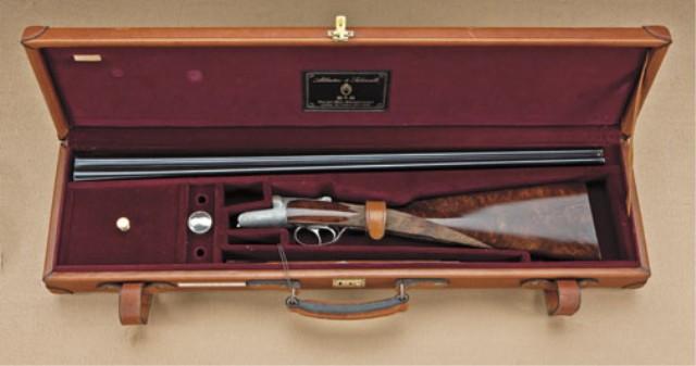 Abbiatico & Salvinelli Zeus model 410ga side by side shotgun with 28-3/8” barrels, beautiful banknote scroll engraved rounded action, select checkered burl walnut stock, with English style straight grip and checkered butt. The gun shows double triggers, auto ejectors, and a hinged front trigger. 14-3/4” pull, right barrel choked Improved Modified, left choked Modified. The gun remains in fine to excellent condition showing no evidence of firing, just slight storage and minor handling, 99% to near mint. The engraving is signed G. Sabatti. Serial #777. The gun is contained within its original trunk type case with trade label in lid. The case is fine to excellent with a few scuffs and mars from storage and transport. From the estate of Robert Petersen. Est: $8,500 - $17,000