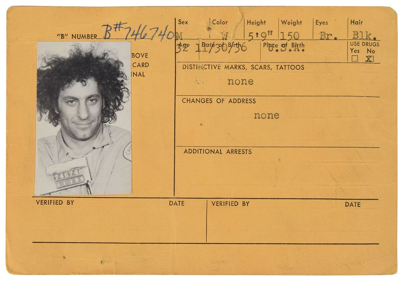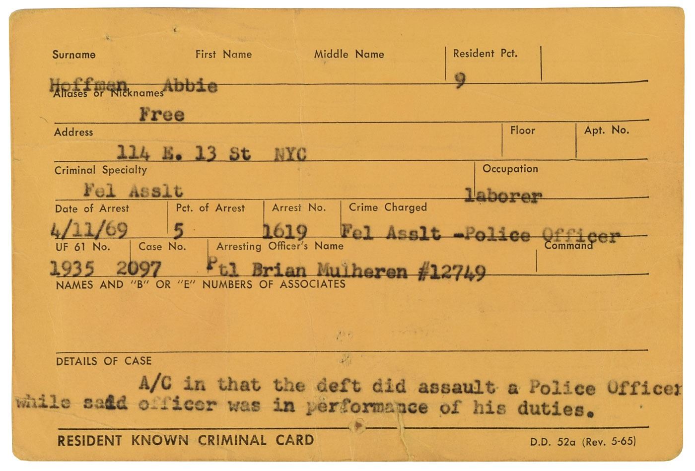 New York Police Department criminal card issued for Abbie Hoffman, one page both sides, 6 x 4, arrest date of April 11, 1969, 'B' Number 746740. The front of the card bears an affixed glossy 1.5 x 2.25 mugshot photo of Hoffman, with adjacent field listing his age, date and place of birth, physical statistics, noted drug use (marked "No"), and distinctive marks, scars, and tattoos ("none"). Reverse of card consists of information relating to Hoffman and his arrest, which identifies the criminal specialty, "Fel Asslt," the crime charged, "Fel Asslt—Police Officer," the arresting officer's name, "Ptl Brian Mulheren," and the details of the case, "A/C in that the deft did assault a Police Officer while said officer was in performance of his duties." In very good condition, with overall creasing, a tack hole, and a short edge tear.