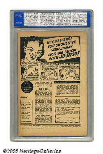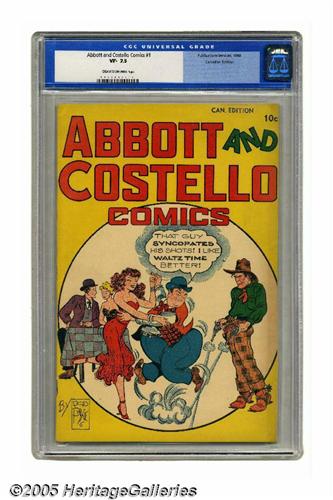 <B>Abbott & Costello #1 Canadian Edition (Publications Services, 1948) CGC VF- 7.5 Cream to off-white pages.</B></I> Who's on first? Well, we're leading off this section of our catalog with a Canadian comic that's got the same cover as #1 of the U.S. series (which has an Overstreet VF 8.0 value of $363). Bizarrely enough, the back cover has indicia for <B>Justice Traps the Guilty</B></I> #4! This Canadian edition is not listed in Overstreet. CGC census 7/05 (for the Canadian edition): 1 in 7.5, none higher.