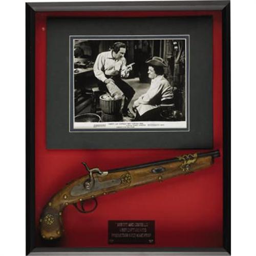 <B>Abbott and Costello Prop Gun from "Meet Captain Kidd."</B></I> A very cool flintlock pistol from the 1952 comedy featuring Bud Abbott and Lou Costello opposite none other than Charles Laughton, who reprised his role as the infamous pirate Captain Kidd from the eponymous 1945 film. The pistol measures 16" in length, is in Very Fine to Excellent condition, and has been mounted and framed along with a b&w 8" x 10" promo photo for the movie in a 17" x 20.75" x 2.5" display box. <I> Accompanied by COA from L.A. Prop and Wardrobe Co.</B></I><BR><BR><b>Shipping:</b> Framed - with Glass, Small (<a target="_blank" href="http://www.heritageauctions.com/common/shipping.php">view shipping information</a>)