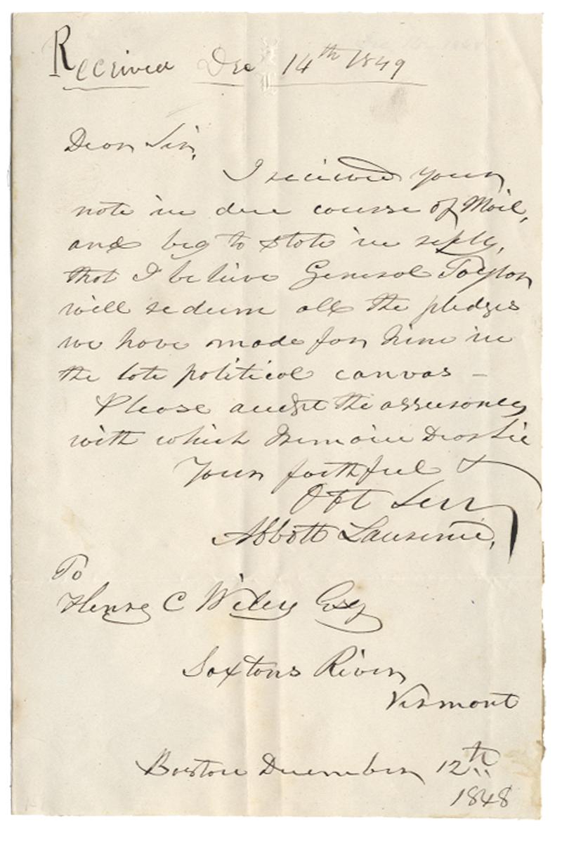 Abbott Laurence (1792 – 1855). American businessman, politician and philanthropist. Founder of Lawrence, Massachusetts. ALS. 1 page. Boston Dec. 12th, 1849. To Henry C. Wiley, Esq., Saxton’s River, Vermont.; “I received your note in due course of mail and beg to state in reply that I believe General Taylor will redeem all the pledges we have made for him in the late political canvas. Please accept the assurances with which I remain dear sir, Your faithful obt. Servt. Abbott Lawrence” Folds. Fine