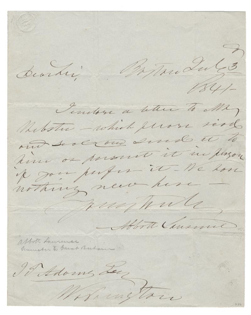 Abbott Laurence (1792 – 1855). American businessman, politician and philanthropist. Founder of Lawrence, Massachusetts. ALS. 1 page. Boston, July 3, 1841. To John T. Adams, Washington, D.C. “I enclose a lwtter to Mr. Webster which please read and seal and send it to him or present it in person if you prefer it. We have nothing new here, Yours Truly, Abbott Lawrence” Folds. Fine.