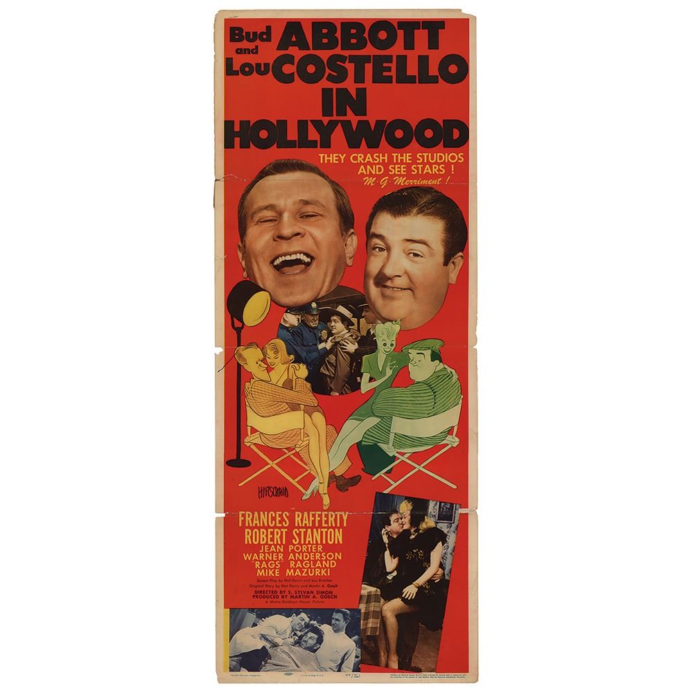 Original color 14 x 36 poster for the 1945 comedy Bud Abbott and Lou Costello in Hollywood, featuring artwork by legendary caricaturist Al Hirschfeld, signed at center in black felt tip, "Hirschfeld." Pencil collector's notations on the reverse denote where the signature was obtained. In very good condition, with some paper loss and tears along the edges, and repaired partial separations along horizontal folds.