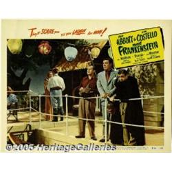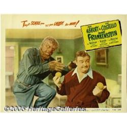 <B>Abbott and Costello Meet Frankenstein (Realart, R-1956).</B></I> Lobby Cards (2) (11" X 14"). The creepers are after Bud and Lou in this who's who of terrific ghouls! Universal cast their beloved monsters along with their popular comedians in this hilarious spoof! Bela Lugosi, Lon Chaney Jr., Glenn Strange, and the voice of Vincent Price were the foils for the famous duo. Offered in this lot are two cards from the 1956 Realart reissue, each featuring Lon Chaney Jr., one as the tormented Lawrence Talbot and the other as his monstrous incarnation, the Wolfman. Both cards are near flawless. From the collection of Johnny Ramone. Near Mint. 2 items