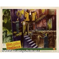 <B>Abbott and Costello Meet Frankenstein (Universal, 1948).</B></I> Lobby Card (11" X 14"). Throughout the film poor Wilbur (Lou Costello) witnesses the transformation and reanimation of all the Monsters, but can't convince the ever-doubting Chick (Bud Abbott), until the wild climax in Dracula's castle when the distraught duo are pursued by all three of the film's monstrosities. This is a scene from the climax that shows the two timid heros being cornered by Dracula and Frankenstein's monster. Other than one tiny little scrape in the lower right corner, the card is mint. From the collection of Johnny Ramone. Near Mint/Mint.