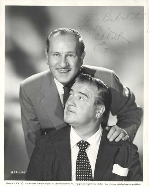 William "Bud" Abbott and Lou Costello were an American comedy duo whose work in vaudeville and on stage, radio, film and television made them the most popular comedy team during the 1940s and early 1950s. Their patter routine "Who's on First?" is considered one of the greatest comedy routines of all time and set the framework for many of their best-known comedy bits. Great 8"x10" inscribed signed photo of this comedy duo,"To Babe & Ester Love Abbot & Costello".