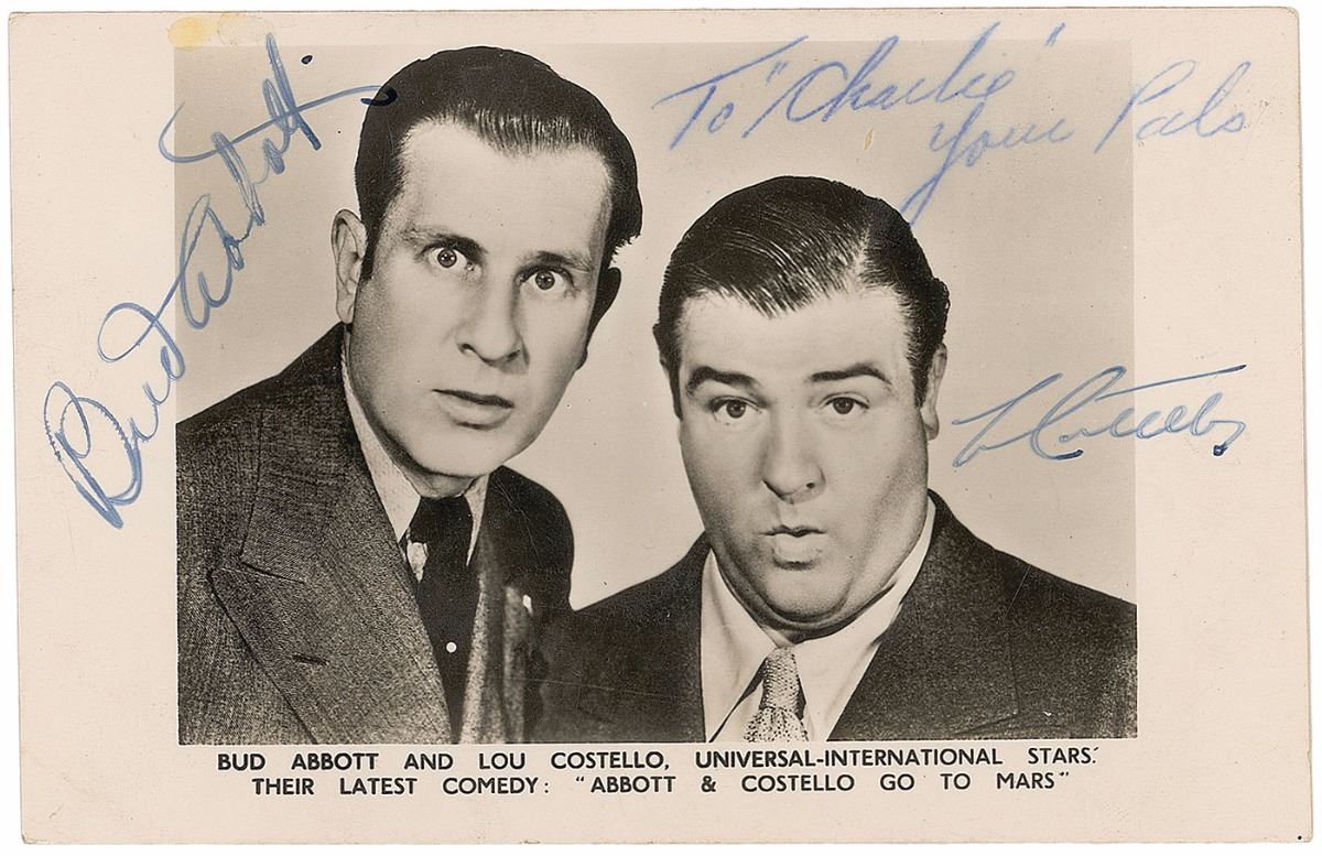 Semi-glossy 5.25 x 3.5 Universal-International publicity photo of Bud Abbott and Lou Costello, signed in fountain by both, with an unknown hand adding an inscription in blue ballpoint, “To ‘Charlie,’ Your pals.” In fine condition, with a spot of soiling to upper left.