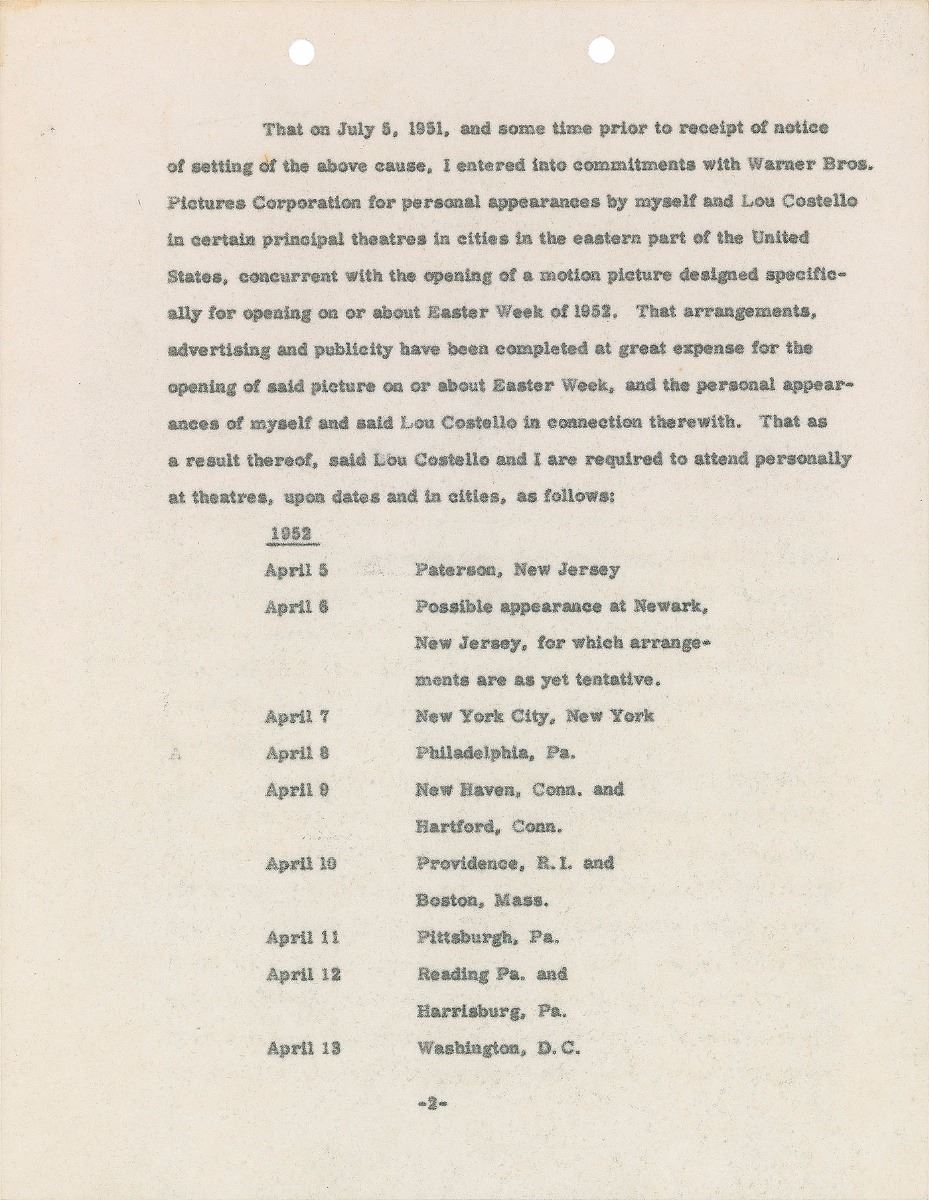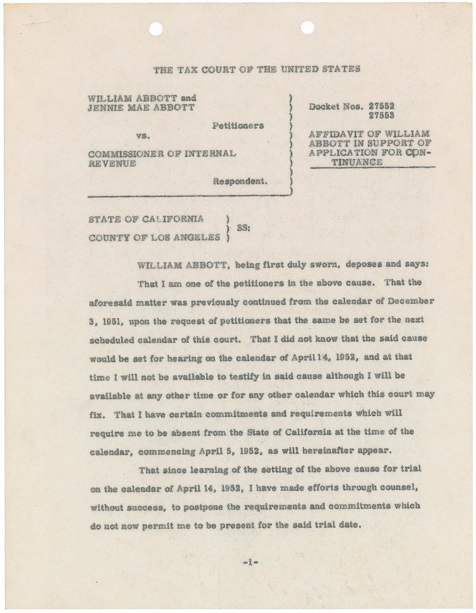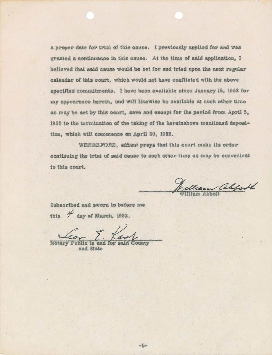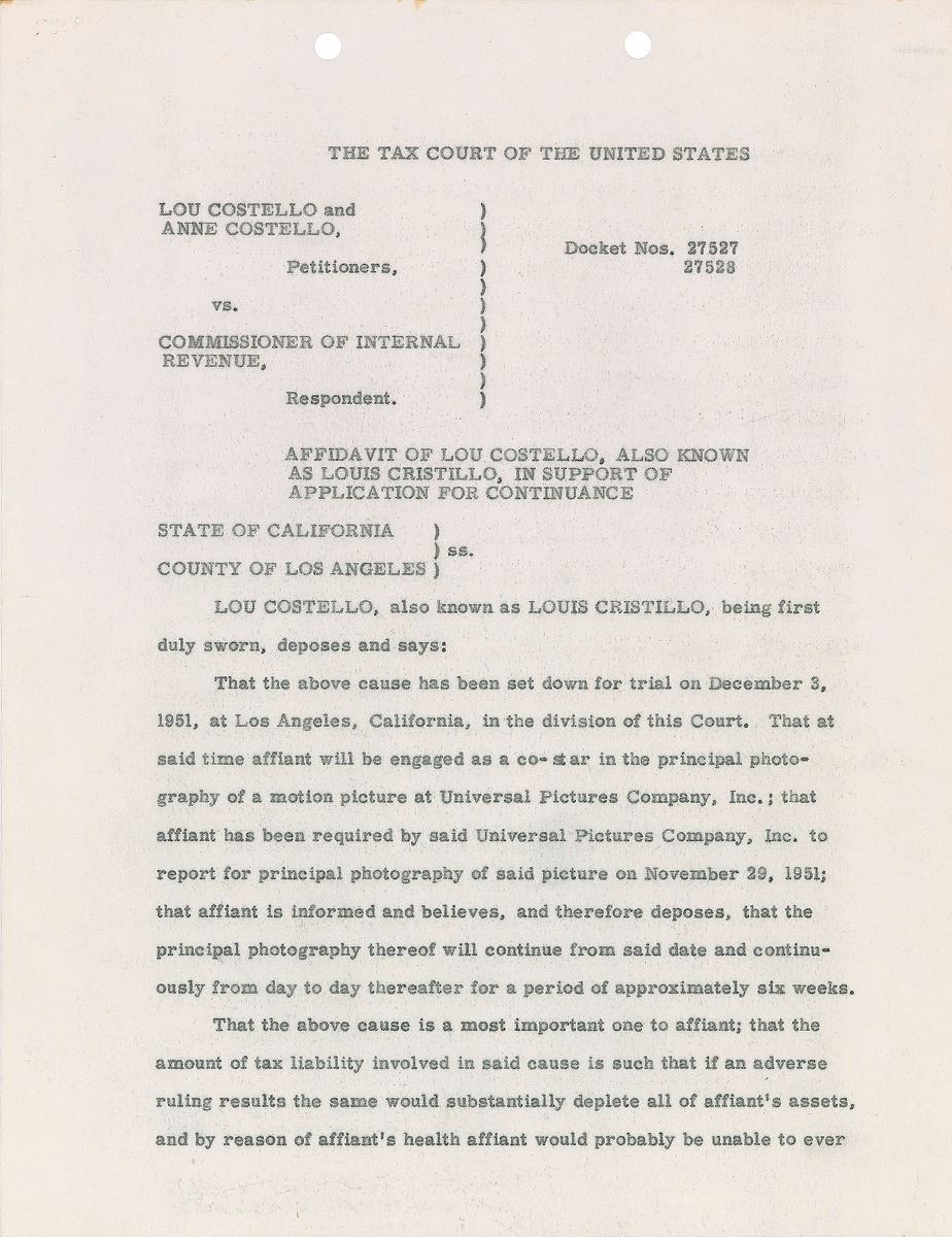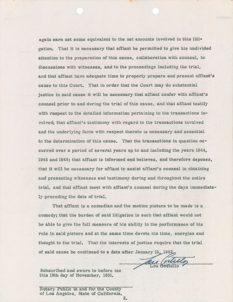 Two DSs, signed “William Abbott” and “Lou Costello,” six onionskin pages in total, both 8.5 x 11, dated November 19, 1951, and March 4, 1952. Pair of affidavits supporting applications for continuance individually made by Abbott and Costello to the Tax Court of the United States. Both entertainers sign at the conclusion of their respective document. One page is missing from the Abbot document. In overall fine condition. Both documents are accompanied by full letters of authenticity from PSA/DNA.