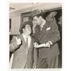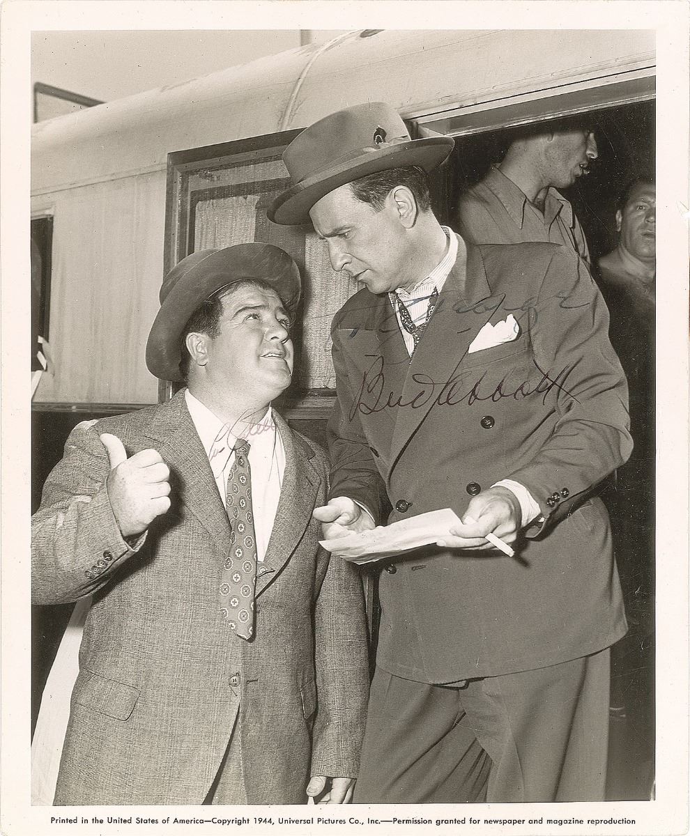 Vintage circa 1944 glossy 8 x 10 Universal Pictures publicity photo of the two comedic actors conversing outside of a train, signed and inscribed in fountain pen, "To George, Bud Abbott" and "Lou Costello.” In very good to fine condition, with scattered light creasing. Pre-certified PSA/DNA.