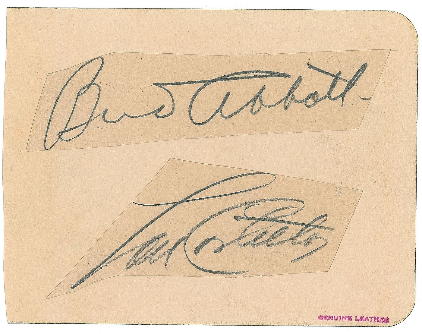 Vintage pencil signatures, "Bud Abbott" and "Lou Costello,” on individual off-white closely clipped slips affixed to a 5.75 x 4.5 album page. In very good to fine condition, with a corner crease to the Costello.