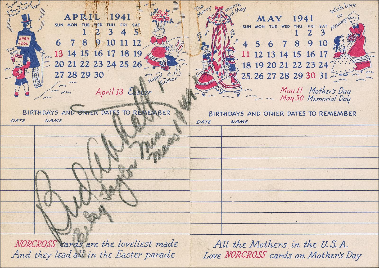 Vintage Norcross Blue Book datebook from 1941, 3.25 x 4.5, signed inside in pencil on two different pages by Lou Costello (January) and Bud Abbott (April). Book also bears several other signatures and notations throughout, including one directly under Abbott’s signature. In fine condition, with some mild toning and soiling, several rusty paperclip marks to Abbott’s page, and light handling wear. Accompanied by a small handwritten collector’s note which reads, “My mother saw him at the ‘Mayfair’ in the Summer of 1941. She saw ‘Abbott and Costello.’” Pre-certified PSA/DNA and RRAuction COA.