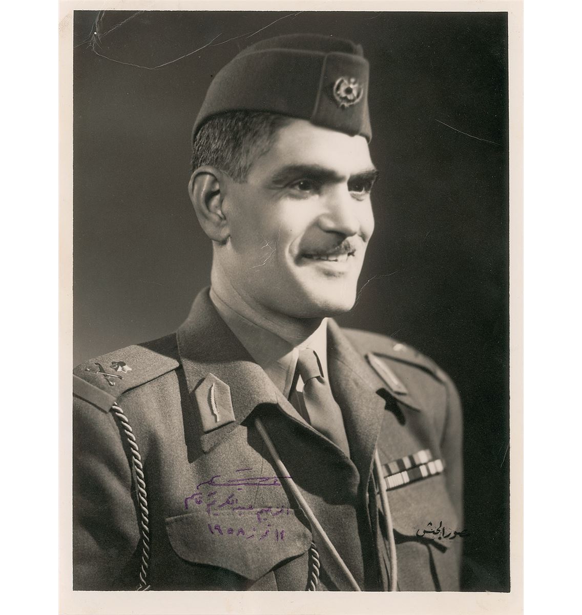 Nationalist Iraqi Army brigadier (1914–1963) who seized power in a 1958 coup d'état and ruled the country as prime minister until his downfall and death during the 1963 Ramadan Revolution. Rare vintage 6 x 8 head-and-shoulders photo of Qasim in his military uniform, signed in purple ink in Arabic. In very good condition, with scattered creases and cracks to finish (most noticeably to his cheek).