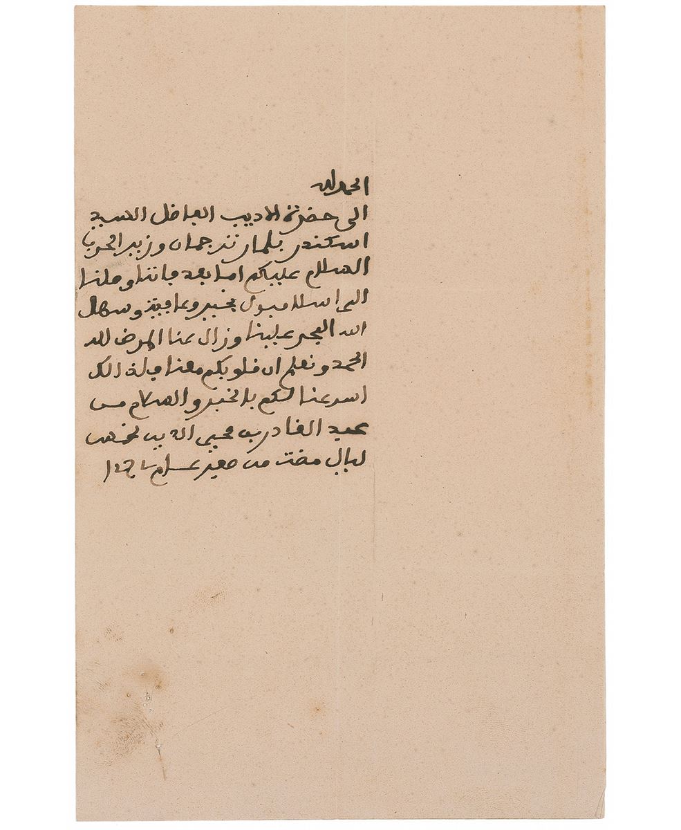 Algerian religious and military leader who led a struggle against the French colonial invasion (1808–1883). ALS in Arabic, one page, 5.25 x 8, November 30, 1851. Diplomatic letter to Alexandre Bellemare, interpreter to the Minister of Defense, informing him that he has arrived in Constantinople. Intersecting folds and soiling and pinholes to lower left, otherwise fine condition. Accompanied by a period translation into French.