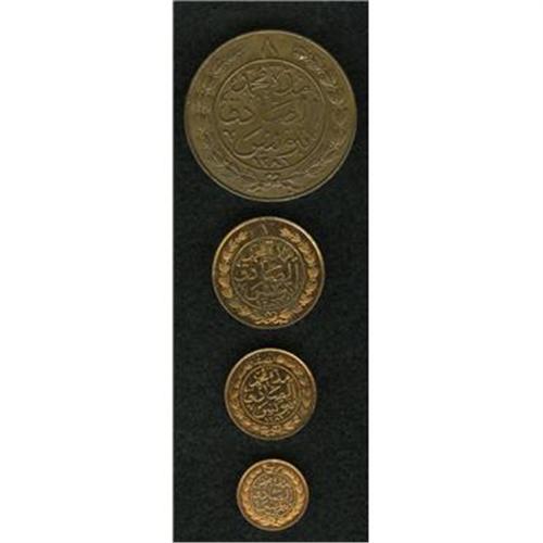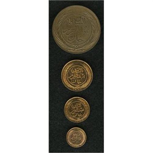 <B>Abdul Aziz Bronze Proof Trio, </B></I>the partial Heaton Mint Specimen Proof Set dated 1281AH (1864), KM153-155, 1/4, 1/2 and 1 Kharub, the 1/2 and 1 Kharub with light spotting, plus a choice lustrous UNC example of the 8 Kharubs KM159, now very scarce in Mint State.