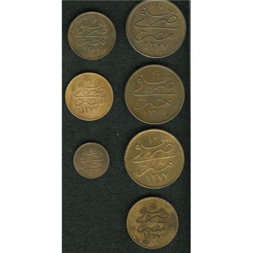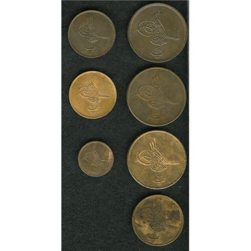 <B>Abdul Aziz Bronze Type Selection, </B></I>KM240 4 Para 1277/4, nice lustrous UNC, KM241 10 Para 1277/6, UNC, lightly dipped long ago and 1277/7, brown XF, KM244 20 Para 1277/5, brown XF, and KM248 40 Para, three examples, brown XF and XF-AU, and choice lustrous UNC, very scarce and appealing grade. All of these types were struck at the Paris Mint and do not have the flower ornament to the right of the tughra. <B>Sold as is, no return lot.</B></I>
