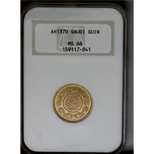<B>Abdul Aziz bin Saud gold Guinea 1370AH (1950), </B></I>KM36, MS66 NGC.