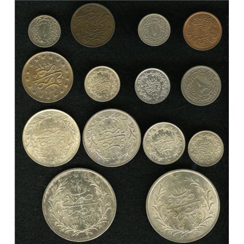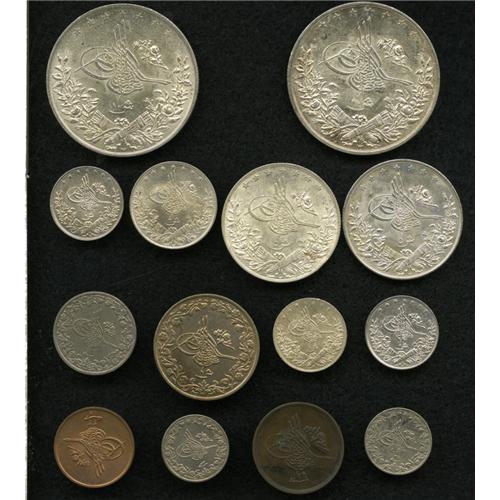 <B>Abdul Hamid II Type Selection, </B></I>KM287 1/40 Piastre 1293/33H, choice brilliant UNC, KM288 1/20 Piastre 1293/29, brown XF, KM289 1/10 Piastre 1293/23, UNC, and Year 28, XF, KM290 2/10 Piastre 1293/12, XF, KM299 Piastre Copper-Nickel 1293/33H, UNC, KM292 Silver Piastre 1293/10, toned UNC and Year 33H, two pieces, cleaned XF and UNC, KM293 2 Piastres 1293/27, choice UNC, KM294 5 Piastres 1293/16, nice toned AU and Year 22, AU, and KM295 10 Piastres 1293/11, choice lustrous AU-UNC and Year 22, AU, minor surface marks. <B>Sold as is, no return lot.</B></I>