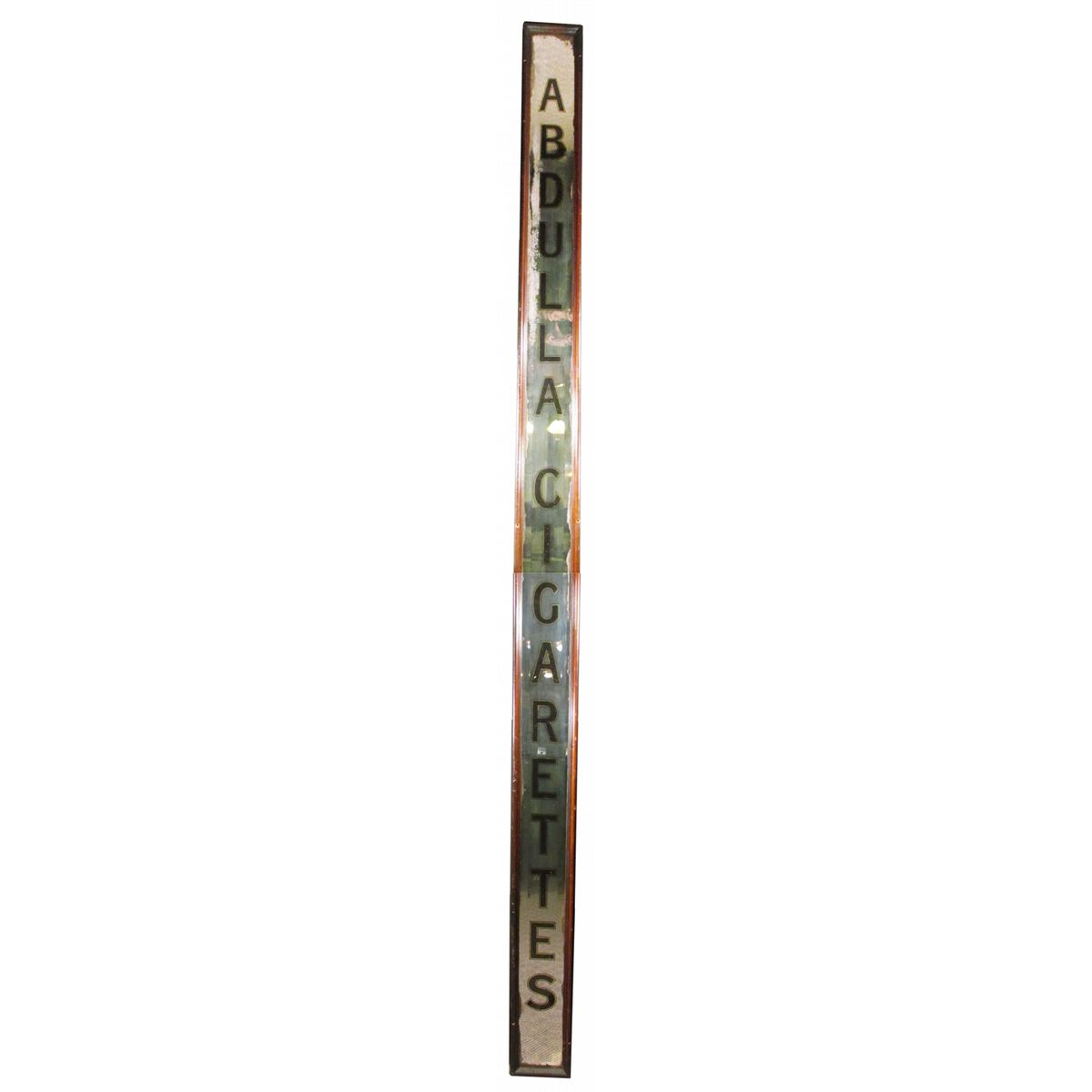 Abdulla Cigarettes Reverse Glass Beveled Sign. Some flaking on the lettering and silver loss on mirror. Framed, 10 foot Tall X 7 1/2 inches wide.