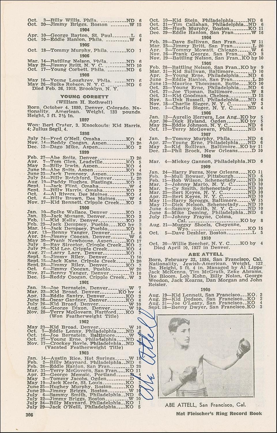 Featherweight boxing champion of the world 1901–1912. Attell later became one of the instigators of the 1919 Chicago Black Sox scandal. Nat Fleischer’s Ring Record Book page, 6 x 9, signed vertically in blue ink, “Abe Attell,” by the boxer next to his image. In fine condition, with trimmed right edge.