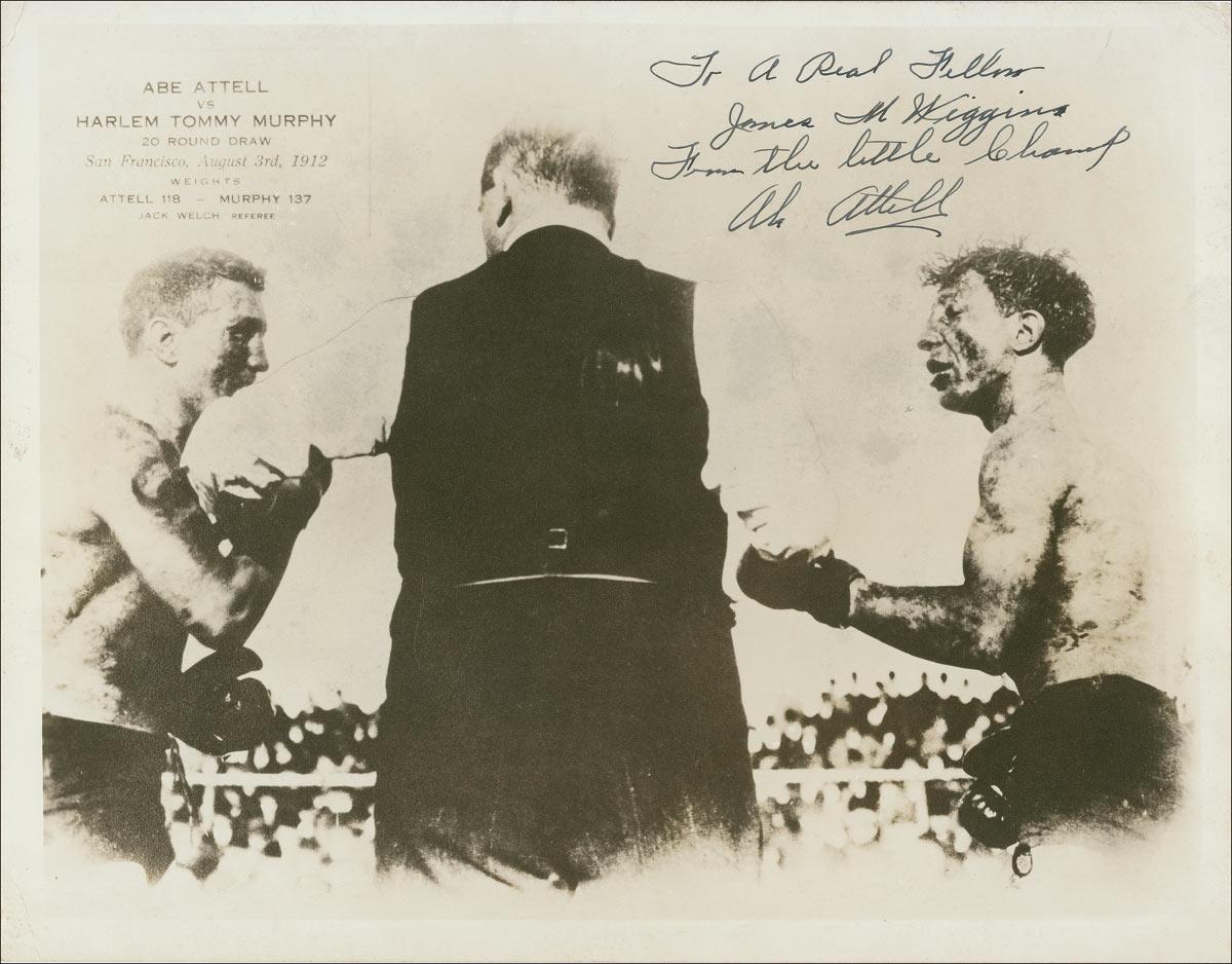 Boxing Hall of Famer (1884-1970) who was featherweight boxing champion of the world 1901–1912. Attell later became one of the instigators of the 1919 Chicago Black Sox scandal. Gripping vintage matte-finish 14 x 11 photo of the brutal conclusion of Attell’s bout against Harlem Tommy Murphy in San Francisco, California, on August 3, 1912, signed and inscribed in fountain pen “To a Real Fellow James M. Wiggins, From the little Champ, Abe Attell.” Light creases, some wrinkling, scattered soiling and staining, and some mild handling wear, otherwise fine condition.