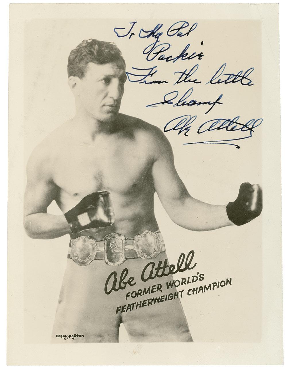 Featherweight boxing champion of the world 1901–1912. Attell later became one of the instigators of the 1919 Chicago Black Sox scandal. Vintage glossy 5 x 6.75 photo of Attell wearing his championship belt, signed and inscribed in fountain pen to fellow boxer Packey O’Gatty, “To my pal Packie, from the little champ, Abe Attell.” A couple light corner creases, some scattered surface marks, and some slight feathering to signature and inscription, otherwise fine condition. A crystal clear image of one of boxing’s greatest, but controversial, figures.