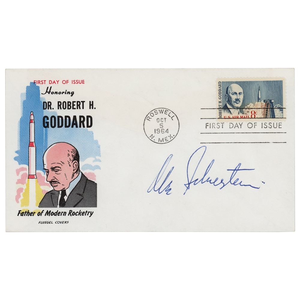 American engineer and NASA manager (1908–2001) who was instrumental in the planning of the Apollo, Ranger, Mariner, Surveyor, and Voyager missions, and is credited with giving both the Mercury and Apollo programs their names. FDC with a cachet honoring rocket pioneer Dr. Robert G. Goddard, signed in blue ballpoint by Abe Silverstein. In very fine condition.