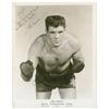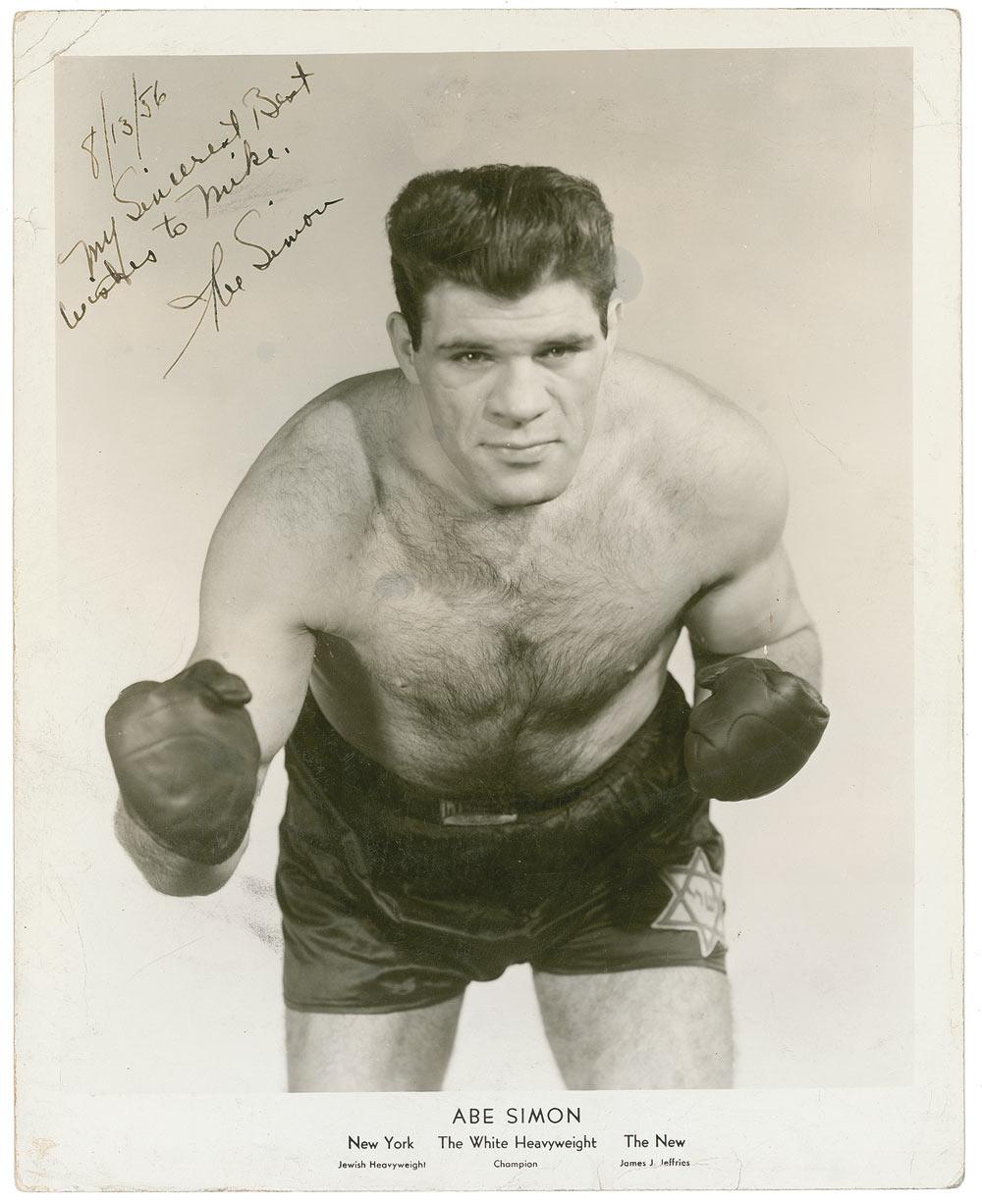 A 250-pound heavyweight nicknamed ‘the Ape’ (1913–1969) who fought Joe Louis twice in the early 1940s when Louis was the heavyweight champion of the world. Vintage heavy stock glossy 8 x 10 photo, signed and inscribed in fountain pen “My Sincerest Best Wishes to Mike. Abe Simon 8/13/56.” In very good condition, with scattered creasing, light surface scratching, and scuffing.