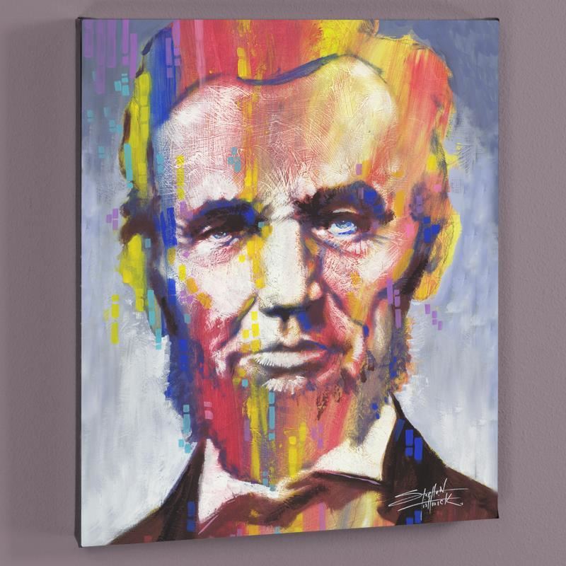 With bright colors and expressive lines, Stephen Fishwick puts a unique spin on pop culture portraits. "Abe" is a limited edition giclee on stretched canvas, numbered and bears the artist's authorized signature. This piece comes gallery wrapped! Includes Letter of Authenticity. Measures approx. 16" x 20" (image). This item requires special handling and may have a longer than usual turnaround.