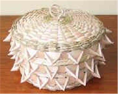The baskets are made using sweetgrass and ash splint weaved into beautiful patterns. Measurements below reflect the size of the actual basket, not the outer decorations (i.e. small handles, exterior curls or points).Height: 3 - 3.5" (7.5 - 9 cm)