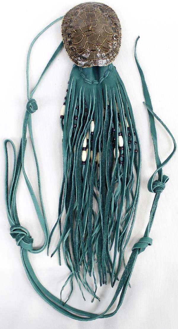Abenaki Nation Turtle Shell & Fringed Leather Medicine Bag by Wild Feather of Missisquoi St. Francis Sokoki Band #3776, pouch measures 17''L including fringe and strap measures 32''L, fringe is embellished with beads, beautiful colors