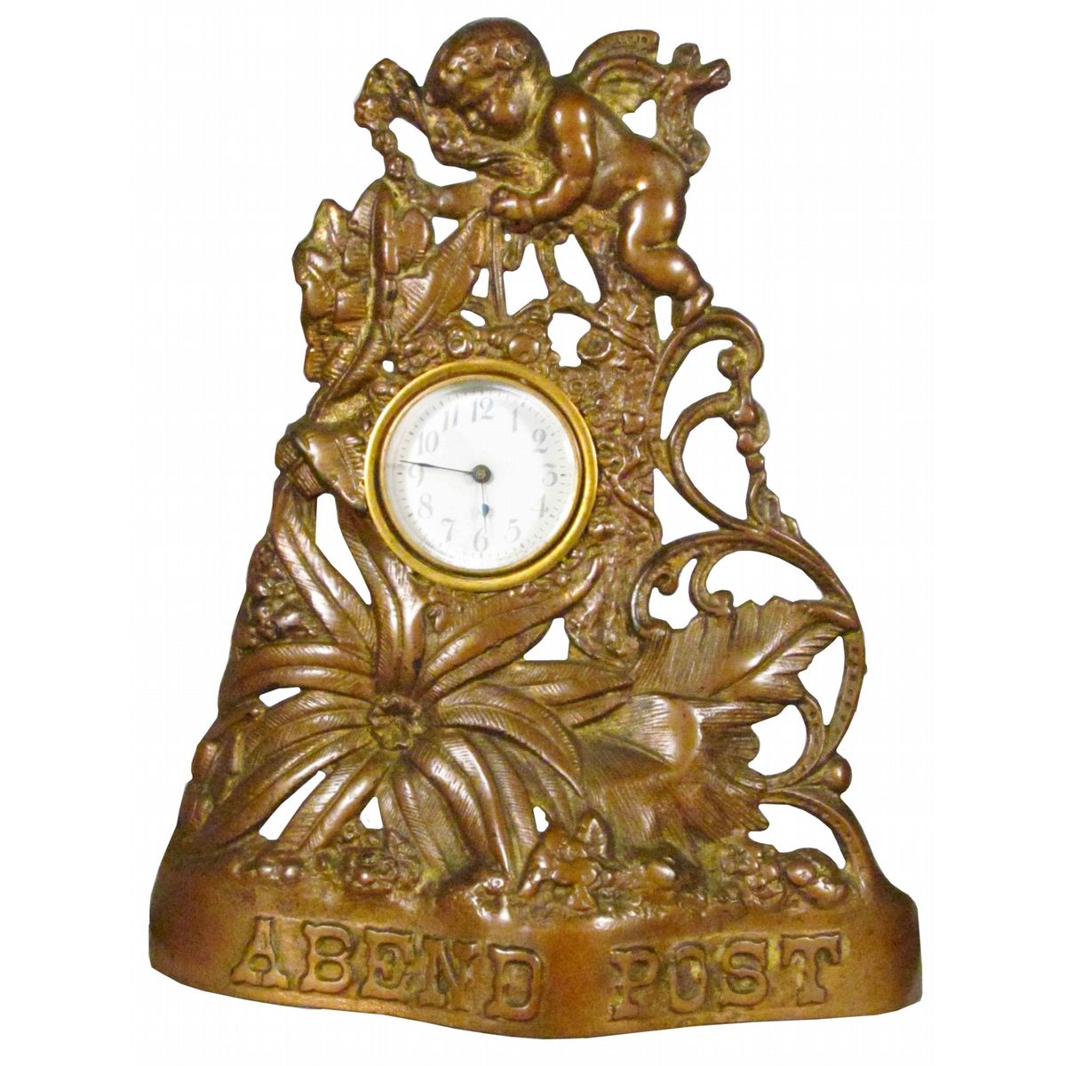 Abend Post Cast Iron Advertising Clock. Cherub and floral motif. Excellent original condition. 8 1/2 X 10 1/2 X 3 inches.