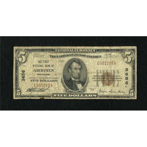 <B>Aberdeen, MS</B></I> - $5 1929 Ty. 1 <B>The First NB</B></I> Ch. # 3656<BR> Very typical of surviving notes from this Deep South state, this example is a well circulated <B>Very Good</B></I>. Only a couple of dozen small size are reported on this one bank community.<BR><I>From The Kansas City Collection</B></I><BR><BR><b>Shipping:</b> Coins & Currency (<a target="_blank" href="http://www.heritageauctions.com/common/shipping.php">view shipping information</a>)