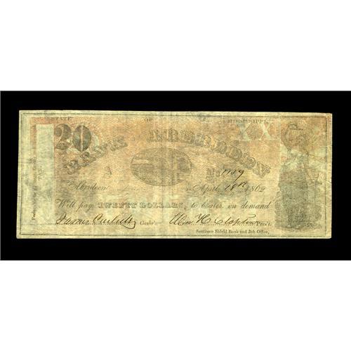 <B>Aberdeen, MS- Bank of Aberdeen</B></I> $20 Apr. 18, 1862 UNL Leggett 12 Kraus 51116a<BR>The face printing is light on this example that is rated a R6 by both Leggett and Kraus. <B>Very Fine.</B></I>