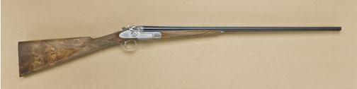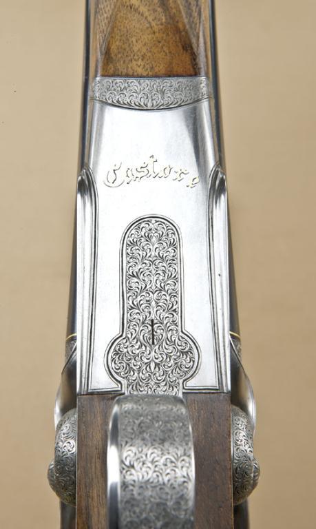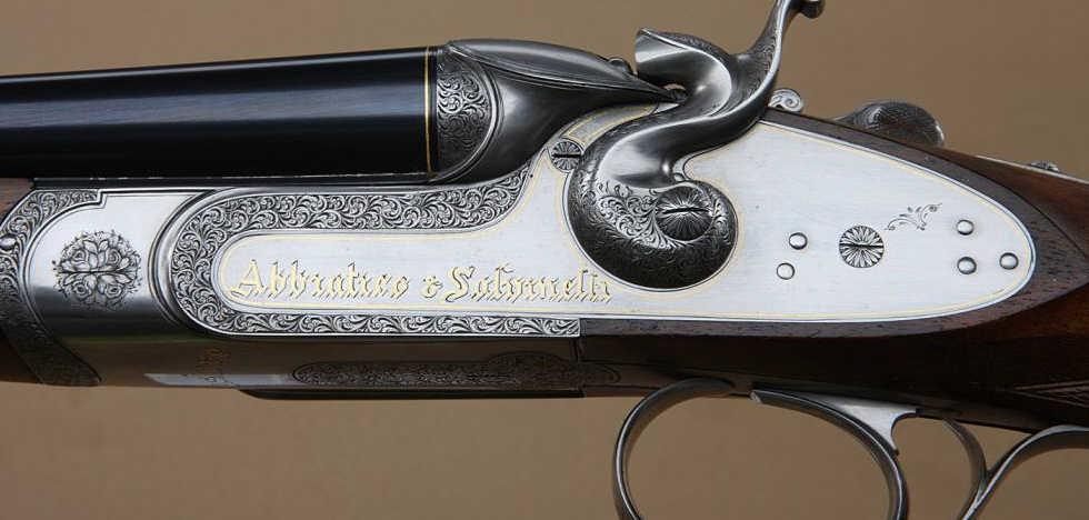Abiattico & Salvinelli 410ga self-cocking exposed hammer Castore-style shotgun, blue and satin finish, English style straight pistol-grip stock, scroll engraved accents, select figured walnut, English stylecheckered butt, engraved by Bruno and signed, serial #518. The gun shows 27-1/8” barrels, stock measures 14-7/8” from the front trigger to the end of the checkered wood butt. Single trigger, auto ejector, gold crown onrelease, with gold name and gold-lined borders. Condition is fine to near excellent showing slight use, 98-99% plus. Some slight firing and use only, with original factory snap-caps, oiler bottle, screwdrivers, andextra springs. With original luggage case showing maker’s label and a few scuffs only. Very few of these self-cocking 410ga A&S’ are ever offered for sale, and are popular with aficionados of high-grade small bore arms.From the Robert Petersen collection. Est: $7,000 - $14,000
