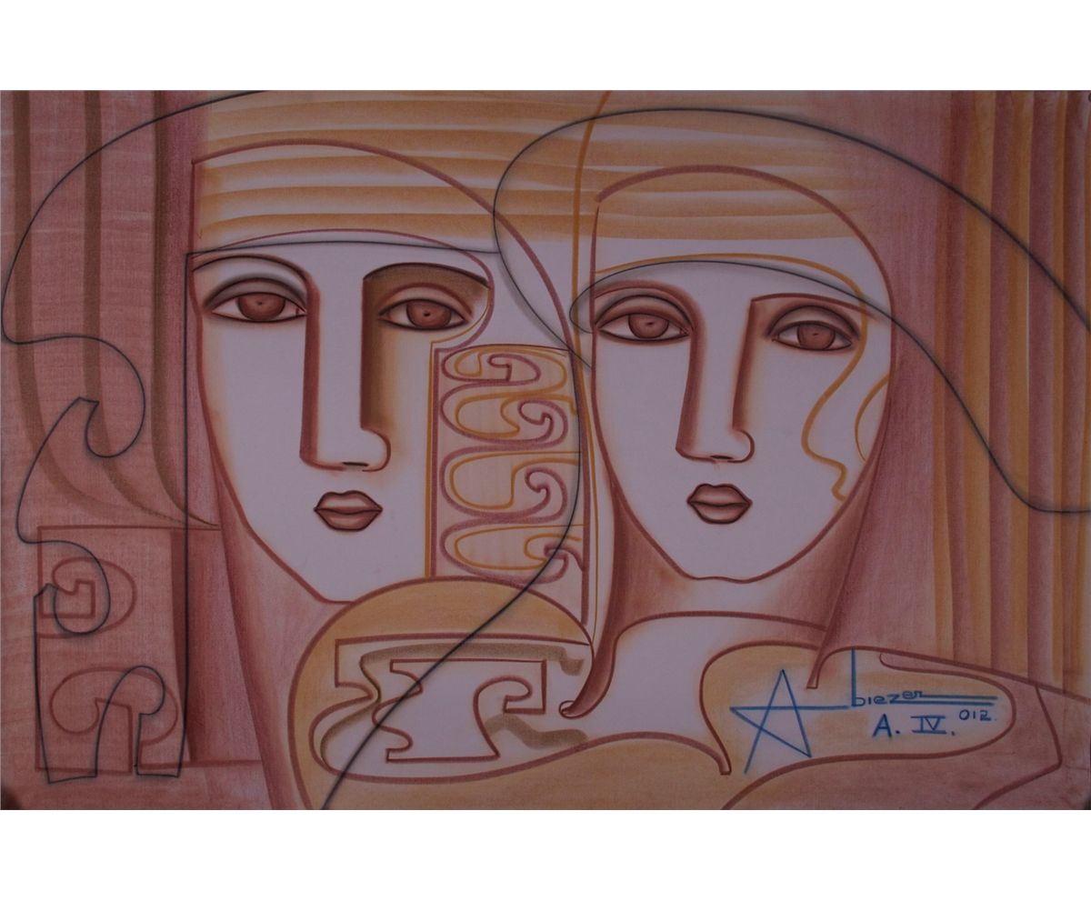 Abiezer Agudelo, (Colombian 20th Century), "Serea En Espacialidad", mixed media on canvas. Accompanied with a Certificate of Authenticity with signature and thumbprint from artist and a photo of artist holding this one of a kind original painting. (Unframed). [< 5(lbs), 39.5(in),59(in),