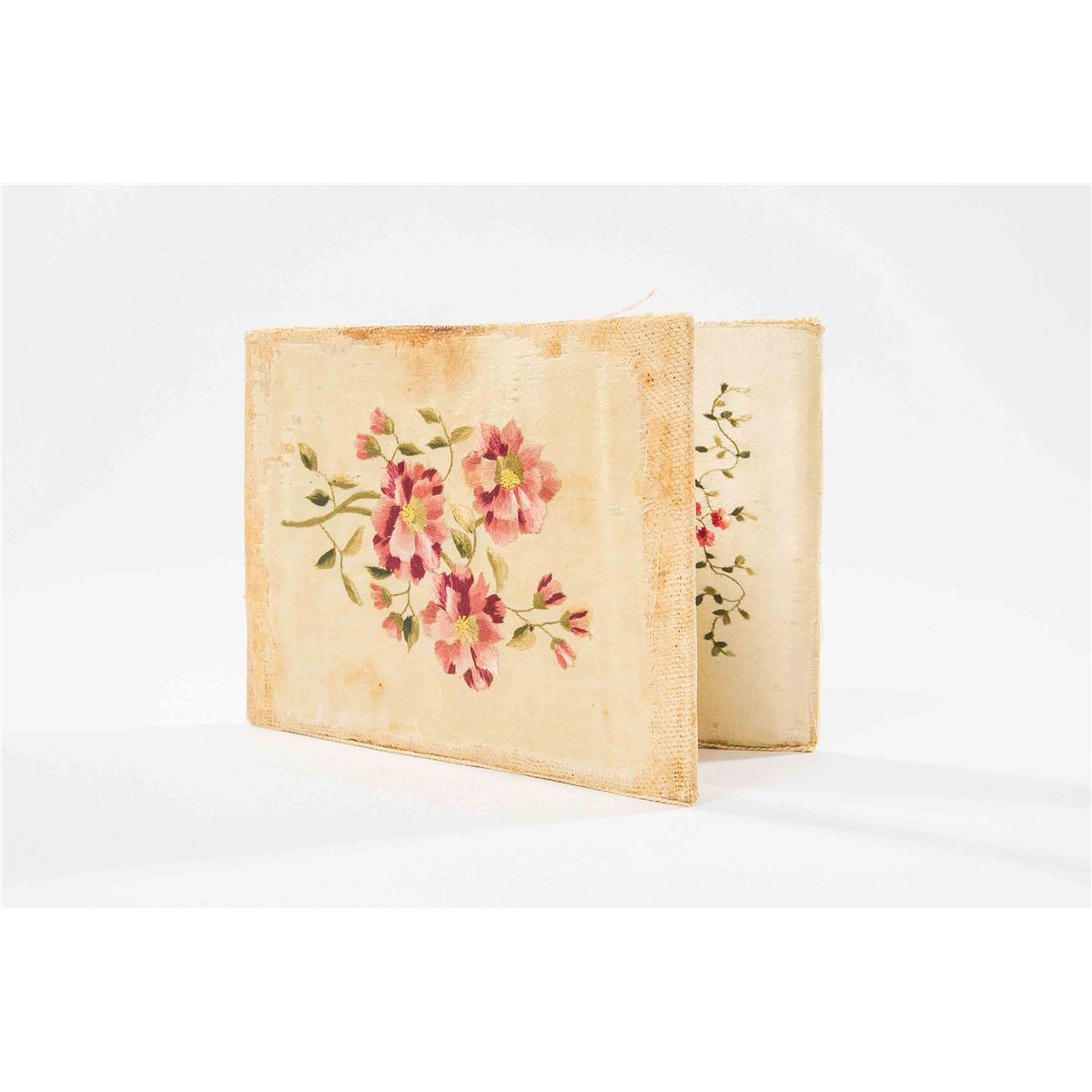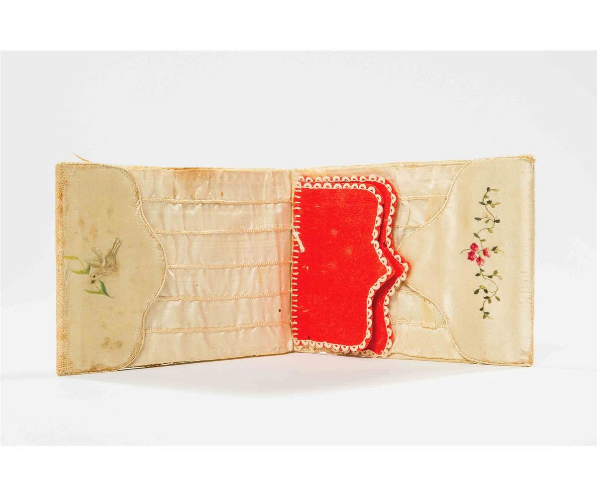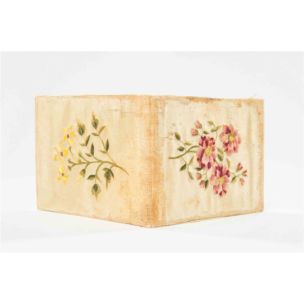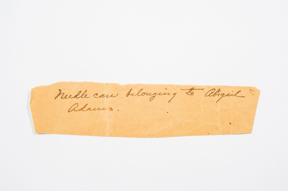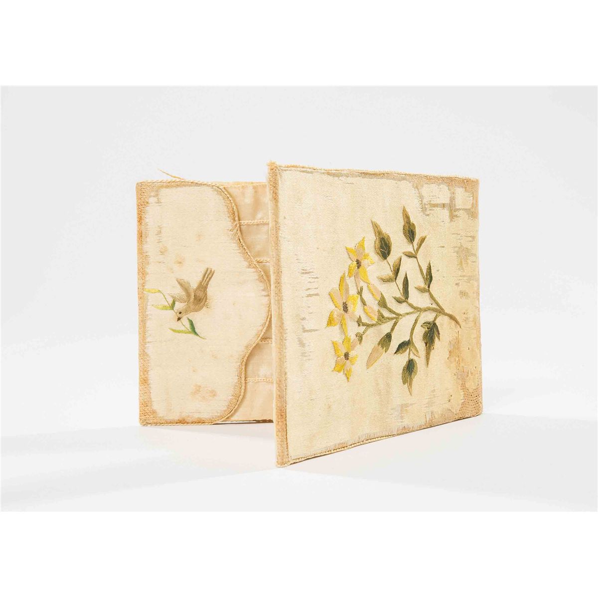 Remarkable collection consisting of Abigail Adams’s personally-owned and -used sewing needle case and two swatches of the dress Adams is seen wearing in her famous portrait by Gilbert Stuart. Her sewing kit needle case, sewn by Abigail Adams herself, is an off-white silk with beautifully embroidered floral designs on both sides, opening to reveal slots for her sewing materials and implements, with two inner pocket flaps nicely embroidered with flower and bird designs. Also included are two generous dress fabric swatches, each measuring 3 x 8, and two different strands of delicate lace trim identifiable in the Gilbert Stuart portrait of the first lady now held by the National Gallery of Art. Includes a July 1876 handwritten letter of provenance from First Lady Abigail Adams’s own granddaughter, Elizabeth Coombs Adams, signed “E. C. A.,” in full: “A piece of Reps silk dress worn by Abigail Adams in London, wife of John Adams, Minister to the Court of St. James, Coming home to Quincy in 1787—& bought the home stead which has had five generations living in it. This dress & long train left to my mother in Abigail’s will. The Reps silk with the pink dots and garnet sattin dress that she is painted in Stuart’s portrait & now belongs to the Charles F. Adams’ & I have the old lace scarf back from the old State House in Philadelphia where we sent things for the Centennial.” The sewing kit is accompanied by a contemporary note in another hand, reading: “Needle case belonging to Abigail Adams.”